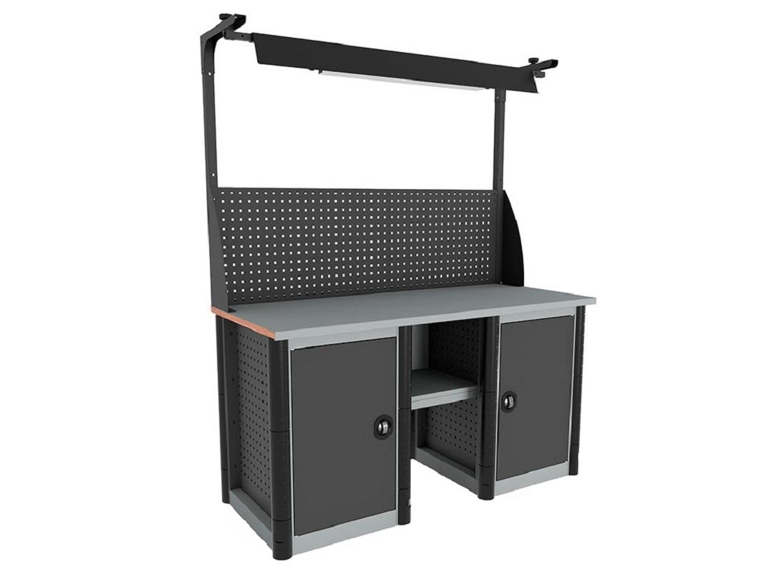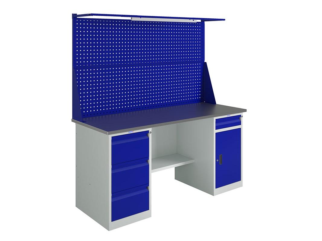Здесь производитель шагнул дальше и как базу использовал грузовой стеллаж с максимальным весом, который держат стойки, до 3000 кг (в рамках конструкции самого грузового стеллажа), но с ограничением по распределенной нагрузке на столешницу в 300 кг. Здесь она уже изготовлена из фанеры толщиной 24 мм и покрыта листом оцинкованного металла в 1,2 мм. Как и прочие серии, верстак MASTER позволяет «поиграть» вариантами размещения полок (не более 100 кг на каждую) и выдвижными ящиками (30 кг). Любопытный вариант для решения бытовых и производственных задач с относительно большими нагрузками и относительно небольшими затратами, т. к. данная серия не сильно оторвалась в стоимости от варианта №1 в нашей статье. Ножки — оцинкованный металл и «полимерка».