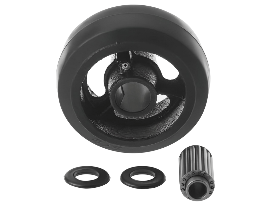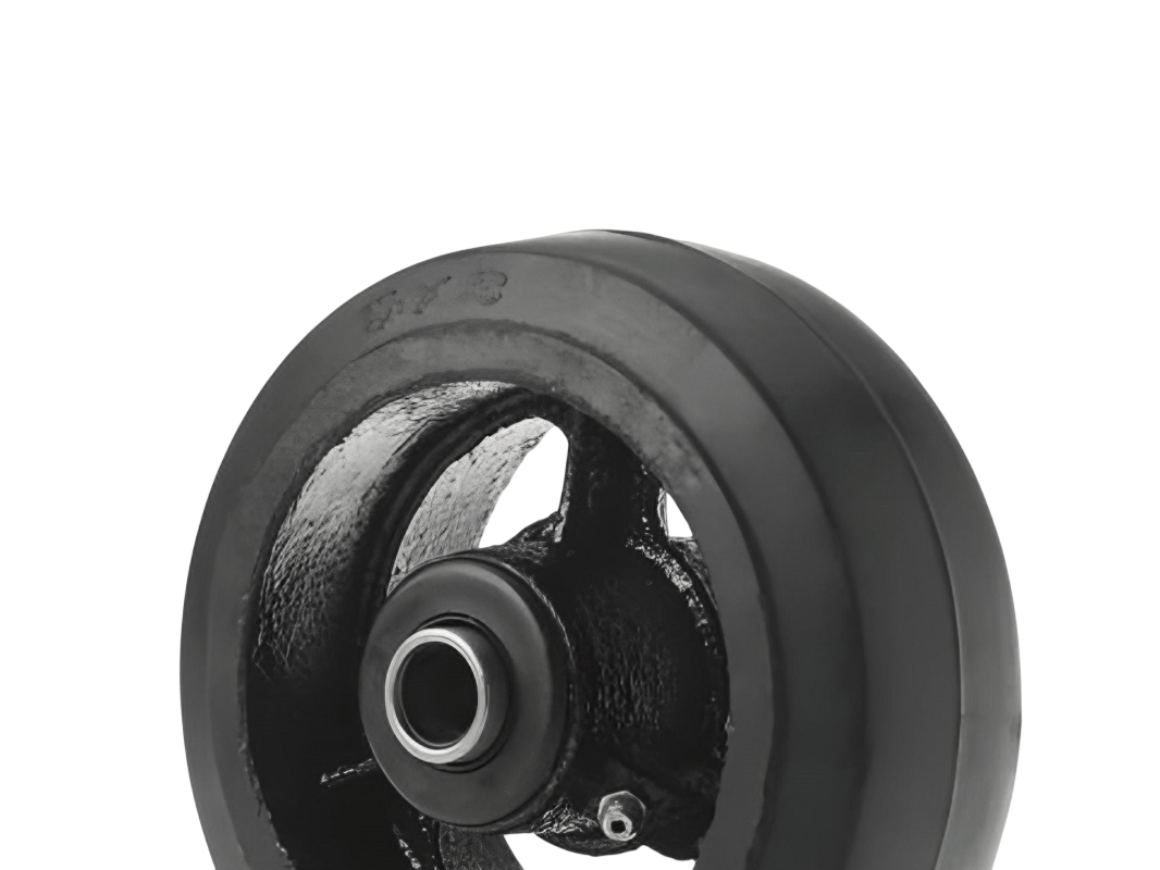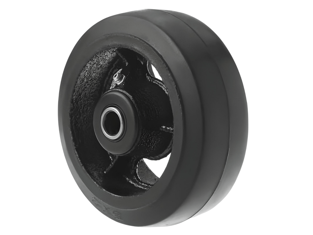 Ступица с роликовым подшипником. Контактная часть выполнена из литой черной резины, которая устойчива к нагрузкам, имеет низкий износ, легко моется водой или мыльным раствором, что позволяет соблюдать санитарно-гигиенические нормы на предприятиях. Чугунные колёсные опоры не желательно использовать на хрупких поверхностях из-за риска повредить пол.