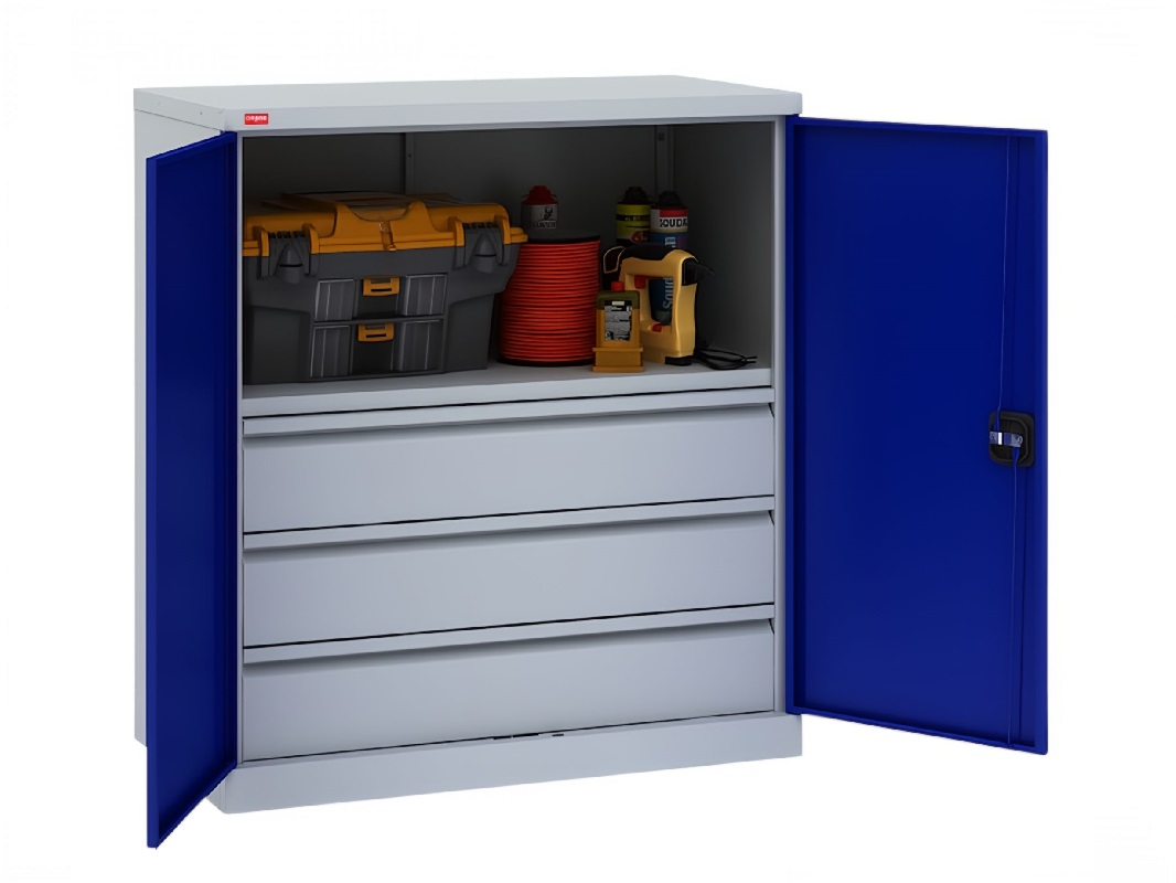 Шкаф инструментальный — распространенный и важный элемент в рабочем пространстве (производство, завод, мастерская, автосервис и т. д.). Используются с целью хранения оборудования и личных вещей рабочих. Такой шкаф помогает оптимизировать рабочее пространство, что значительно упростит и облегчит ежедневный труд. Закрывается на надежный ригельный замок, что позволит защитить от воздействия влаги и других негативных факторов, которые снижают длительность службы инструментов. Также помогает упорядочить и правильно хранить материалы и предметы. Шкафы имеют специальные ящики и крючки для размещения предметов, что обеспечивает безопасное хранение. Конструкция шкафа ограничивает нежелательный контакт с опасными предметами. Вы можете индивидуально смоделировать инструментальный шкаф, выбрав необходимые вам комплектующие и их расположение в шкафу. Износостойкое полимерно-порошковое покрытие позволяет долго сохранять эстетичный внешний вид. Небольшая высота позволит разместить его практически в любом месте, не занимает много места. Укомплектован дополнительными полками, которые позволяют аккуратно разместить весь инструмент.