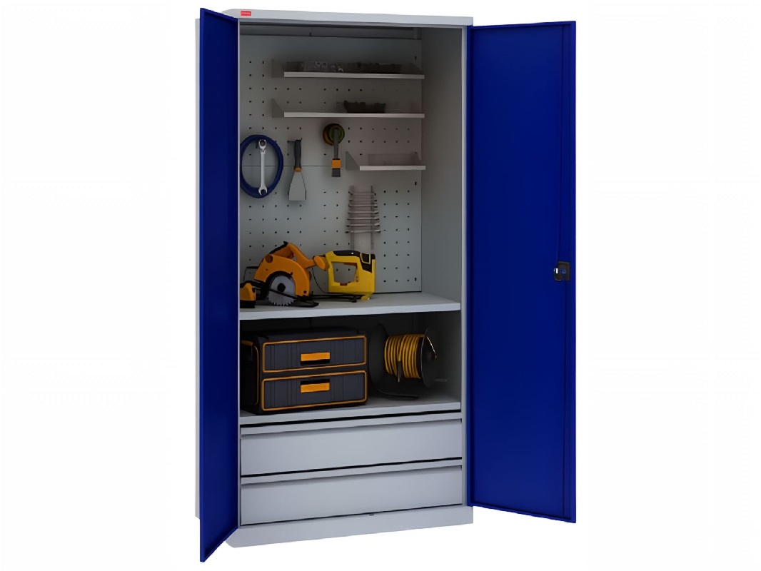 Шкаф закрывается на надежный ригельный замок, который защищает содержимое от влаги и других негативных факторов, снижающих срок службы инструментов. Он также способствует правильному хранению материалов и предметов. Внутри есть специальные ящики и крючки, обеспечивающие безопасное размещение вещей. Конструкция шкафа предотвращает нежелательный контакт с опасными предметами.