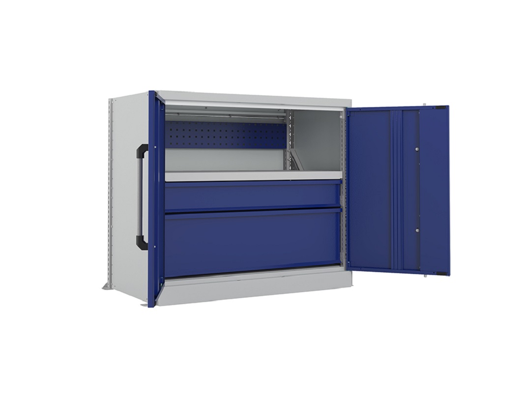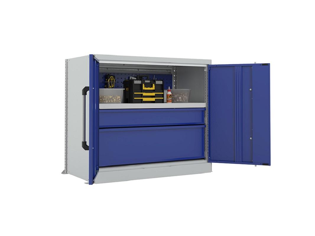 Выдвижной ящик также рассчитан на нагрузку до 95 кг. Помимо него, в шкафу предусмотрен экран для удобного размещения небольших инструментов на специальных держателях. Для еще большего удобства предлагаем оснастить шкаф дополнительными полками и ящиками.