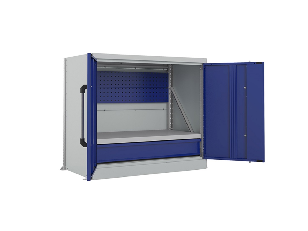 Модульный инструментальный шкаф HARD 1000-021010 предназначен для хранения инструментов, оснастки, тяжелых грузов на производственных площадках. Сама конструкция шкафа состоит из двух рам HARD грузового стеллажа. Дверь изготовлена из толстой стали в 1 мм. В отличие от других шкафов, в этом используется 2-сторонняя ригельная система запирания с ключевым замком Kaba Mauer. Шкаф способен выдержать нагрузки до 1000 килограмм, полка изготовлена из оцинкованной стали толщиной в 1,5 мм с максимальной нагрузкой до 400 килограмм. Выдвижной ящик способен выдерживать нагрузки до 95 килограмм. Помимо выдвижного ящика установлен экран для удобного размещения небольшого инструмента на специальных держателях. Для удобного хранения предлагаем оснастить шкаф дополнительными полками и ящиками.