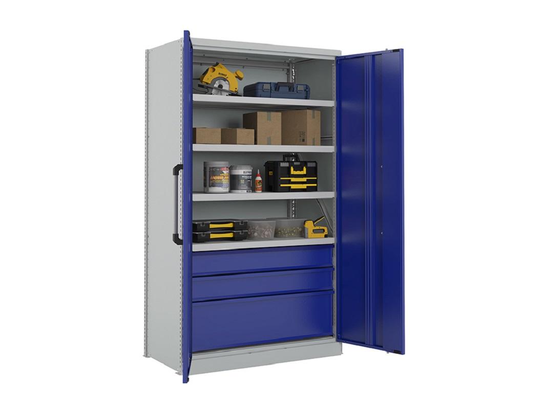 Выдвижной ящик также рассчитан на нагрузку до 95 кг. Помимо него, в шкафу предусмотрен экран для удобного размещения небольших инструментов на специальных держателях. Для еще большего удобства предлагаем оснастить шкаф дополнительными полками и ящиками.