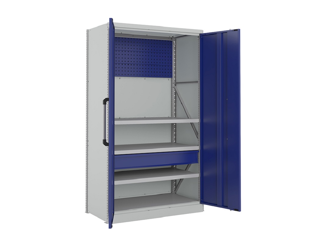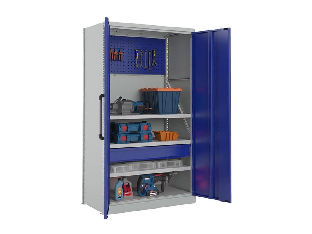 Выдвижной ящик также рассчитан на нагрузку до 95 кг. Помимо него, в шкафу предусмотрен экран для удобного размещения небольших инструментов на специальных держателях. Для еще большего удобства предлагаем оснастить шкаф дополнительными полками и ящиками.