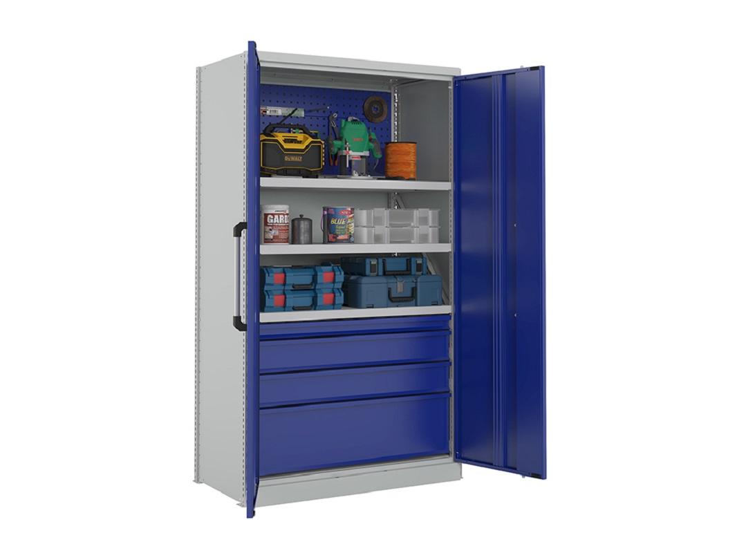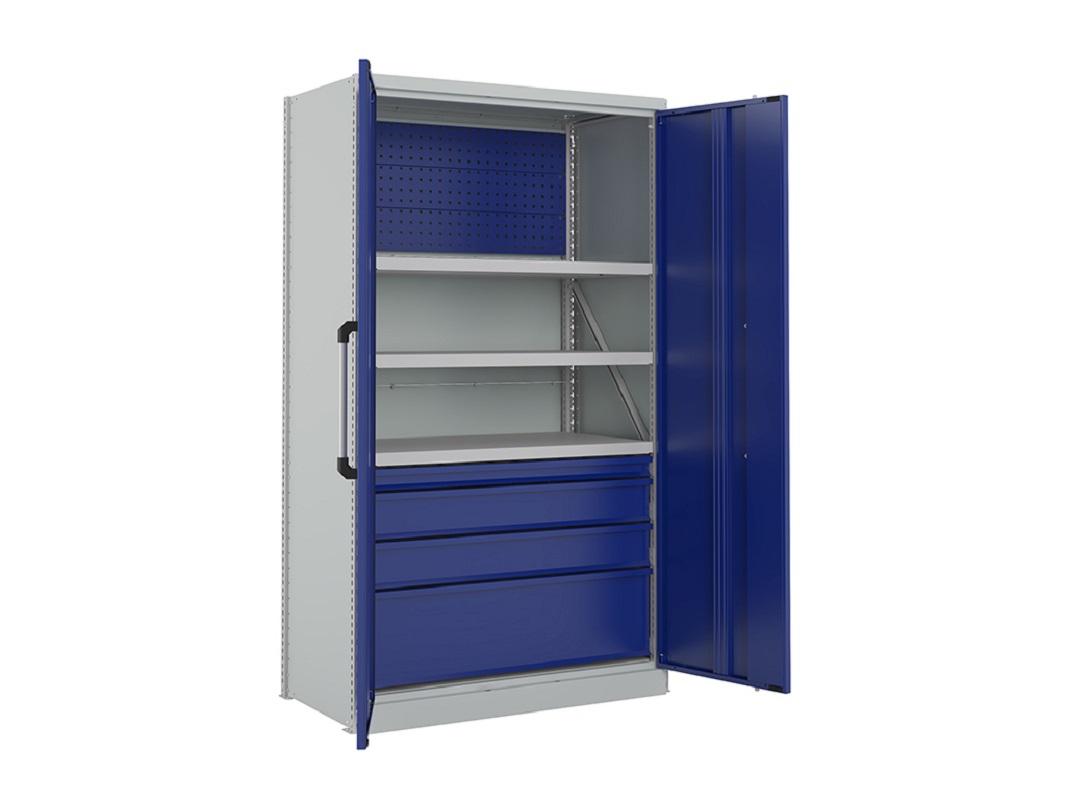 Выдвижной ящик также рассчитан на нагрузку до 95 кг. Помимо него, в шкафу предусмотрен экран для удобного размещения небольших инструментов на специальных держателях. Для еще большего удобства предлагаем оснастить шкаф дополнительными полками и ящиками.