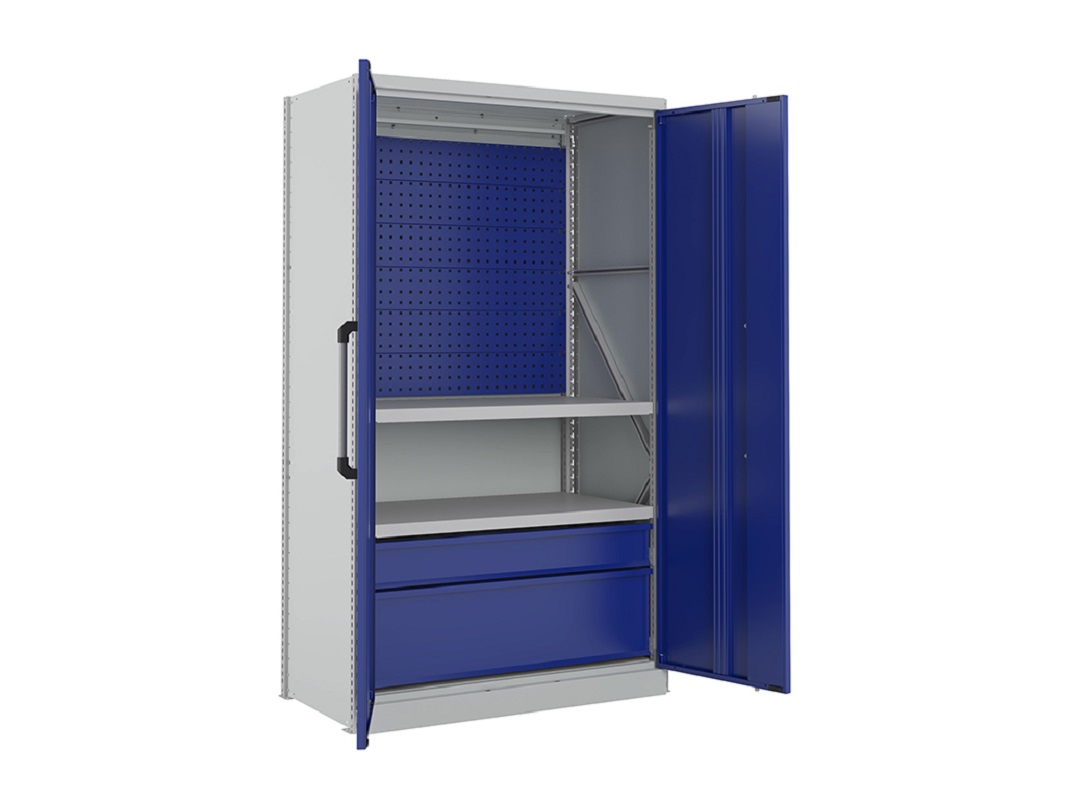 Выдвижной ящик также рассчитан на нагрузку до 95 кг. Помимо него, в шкафу предусмотрен экран для удобного размещения небольших инструментов на специальных держателях. Для еще большего удобства предлагаем оснастить шкаф дополнительными полками и ящиками.