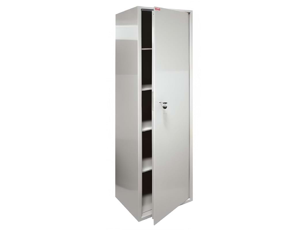 Металлический бухгалтерский шкаф КБС-05Н предназначен для хранения юридических документов, отчетов; печатей предприятия; партнерских контрактов, денежных средств. В зависимости от важности содержимого их оснащают ключевыми или кодовыми замками. Уже давно, наравне с деревянными шкафами, можно встретить металлические. Такие шкафы практичней и служат намного дольше деревянных. Специальное порошковое покрытие защищает его от воздействия окружающей среды. Односекционный, одна большая дверь, внутри которой расположены 4 съемные полки. Полки можно самому регулировать по высоте, петли шкафа находятся внутри.