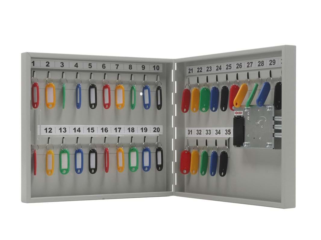 Ключница – это специализированный ящик для хранения ключей. Позволяет объединять и фиксировать все ключи в одном месте, тем самым уменьшает риск их утери и незаконного использования посторонними лицами. Закрывается на замок. Самый распространенный вариант исполнения – металлическая ключница. Размещается стационарно на стене, в корпусе предусмотрены отверстия для крепления. Окрашивание – полимерное. Данная модель имеет 20 крючков для навешивания ключей. Также в комплект входят пластиковые цветные брелоки, рассчитанные на количество ключей. Ключницы используют на предприятиях, в гостиницах, санаториях, общежитиях, в офисах, на контрольно-пропускных пунктах, в многоквартирных домах на посту консьержа и других помещениях.