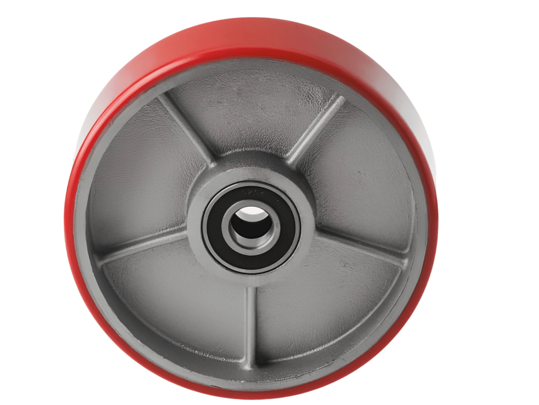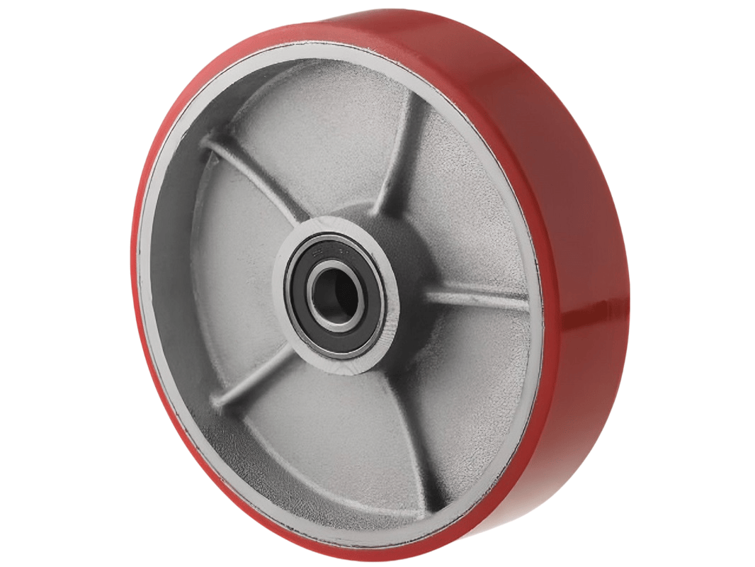 Контактный слой этих колёс выполнен из полиуретана — материала, который отличается долговечностью и может использоваться на полах с любым покрытием. Он обладает высокой износостойкостью и не оставляет следов на поверхности. В оси установлен шариковый подшипник, а обод выполнен из чугуна.