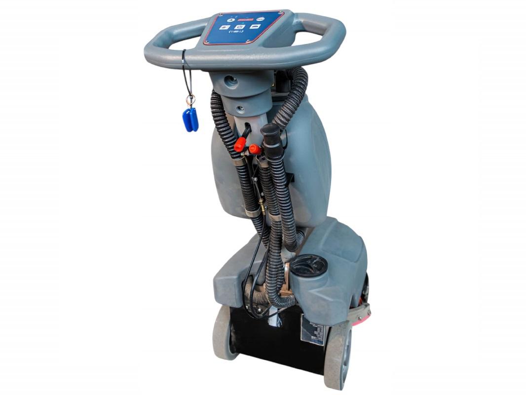 Принцип работы устройства очень прост. Машина подключается к источнику электроэнергии, в нашем случае это аккумулятор. Бак заполняется чистой водой, добавляется моющий раствор. Щетка опускается на пол и активируется электрическим двигателем. Вода подается через форсунки перед щеткой, увлажняя поверхность.