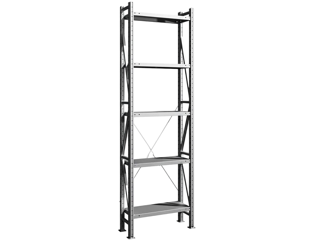 Стеллаж среднегрузовой MS U с высотой 2500 мм и полками длиной 700 мм. Глубина стеллажа 300 мм с максимальной нагрузкой на уровень не более 200 килограмм. Максимальная нагрузка на всю секцию не более 1000 килограмм, при использовании дополнительных комплектов раскосов максимальная нагрузка на одиночную секцию увеличивается до 2000 килограмм. Для такой серии стеллажей минимальное количество полок с высотой до 2 метров составляет 3 штуки, с высотой более 2 метров минимальное количество полок 4 штуки. Допускается установка нижнего яруса не выше 130 мм от пола, с максимальным расстоянием между полками не более 700 мм. Для обеспечения устойчивости стеллаж необходимо крепить к полу с помощью анкерных болтов, минимальная длина должна 100 мм.