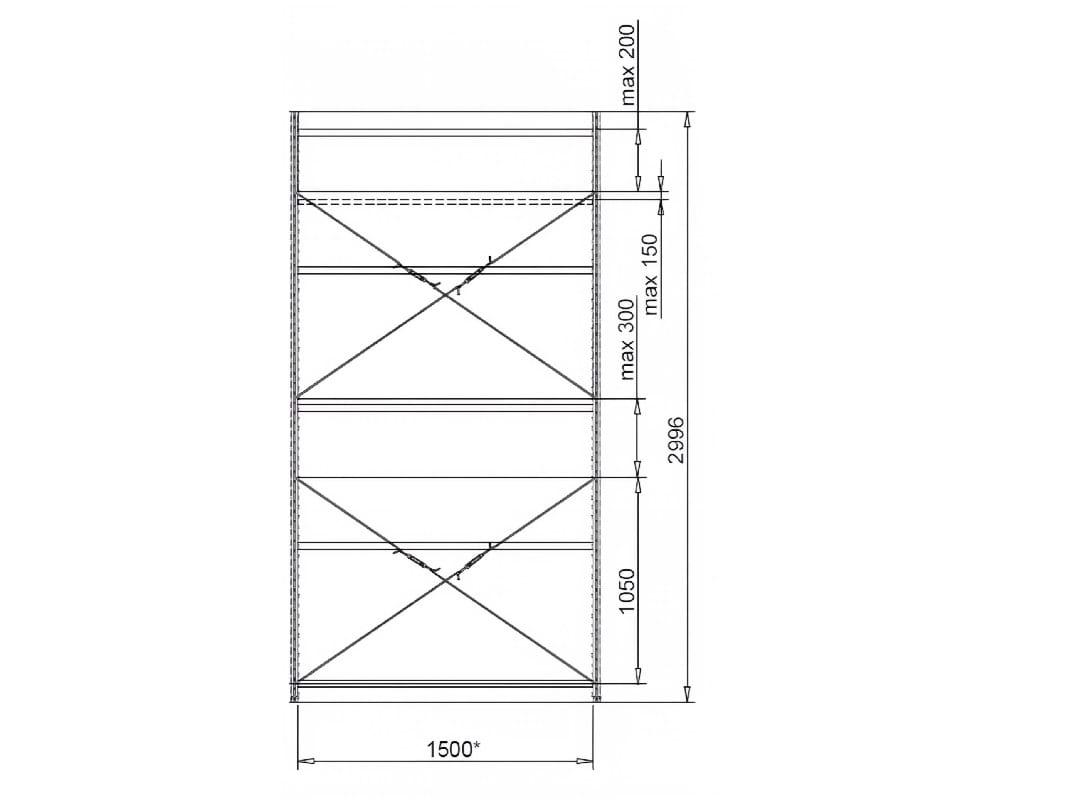Стеллаж среднегрузовой MS U с высотой 3000 мм и полкой длиной 1500 мм. Глубина стеллажа 900 мм с максимальной нагрузкой на уровень не более 300 килограмм. Максимальная нагрузка на всю секцию не более 1000 килограмм, при использовании дополнительных комплектов раскосов максимальная нагрузка на одиночную секцию увеличивается до 2000 килограмм. Для такой серии стеллажей минимальное количество полок с высотой до 2 метров составляет 3 штуки, с высотой более 2 метров минимальное количество полок 5 штуки. Допускается установка нижнего яруса не выше 130 мм от пола, с максимальным расстоянием между полками не более 700 мм. Для обеспечения устойчивости стеллаж необходимо крепить к полу с помощью анкерных болтов, минимальная длина должна 100 мм.