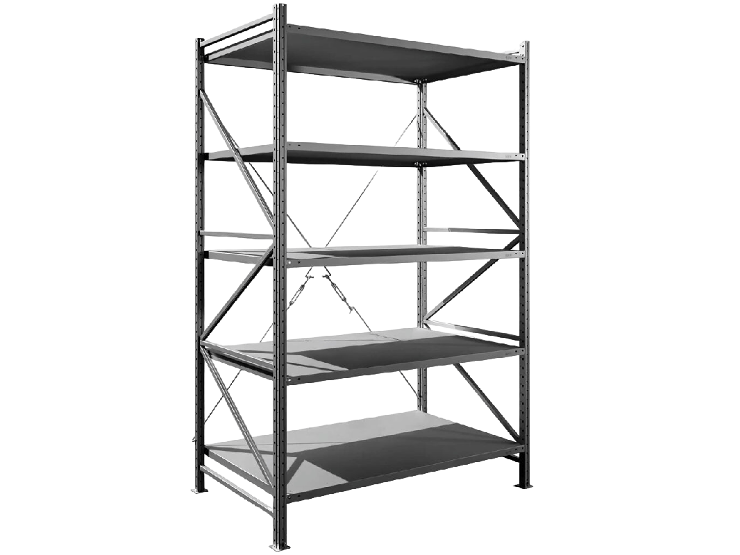 Отличается наличием установленных дополнительных ребер жесткости полки MS U, на каждую полку по 2 штуки, что в свою очередь повышает грузоподъемность полок до 300 килограмм. Так же установлены дополнительные комплект крестовин жесткости.