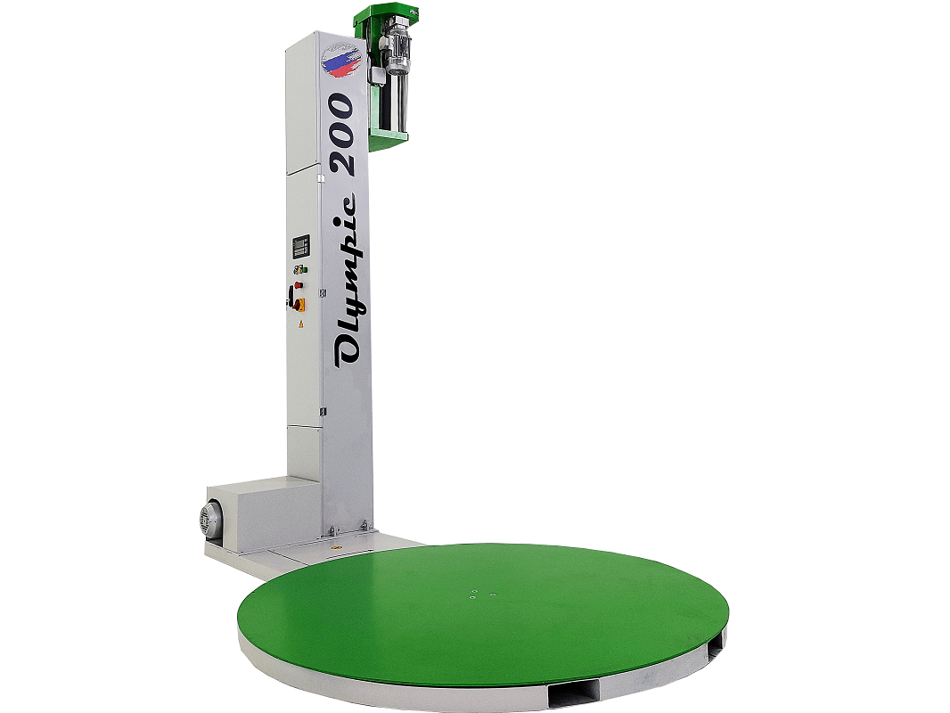Olympic 200 — это полуавтоматическая машина для обмотки паллет стретч‑плёнкой. Оператор устанавливает паллет на платформу, закрепляет конец плёнки и запускает цикл упаковки; далее аппарат самостоятельно выполняет обмотку по заданной программе. По завершении цикла оператор отрезает плёнку и снимает готовый паллет.