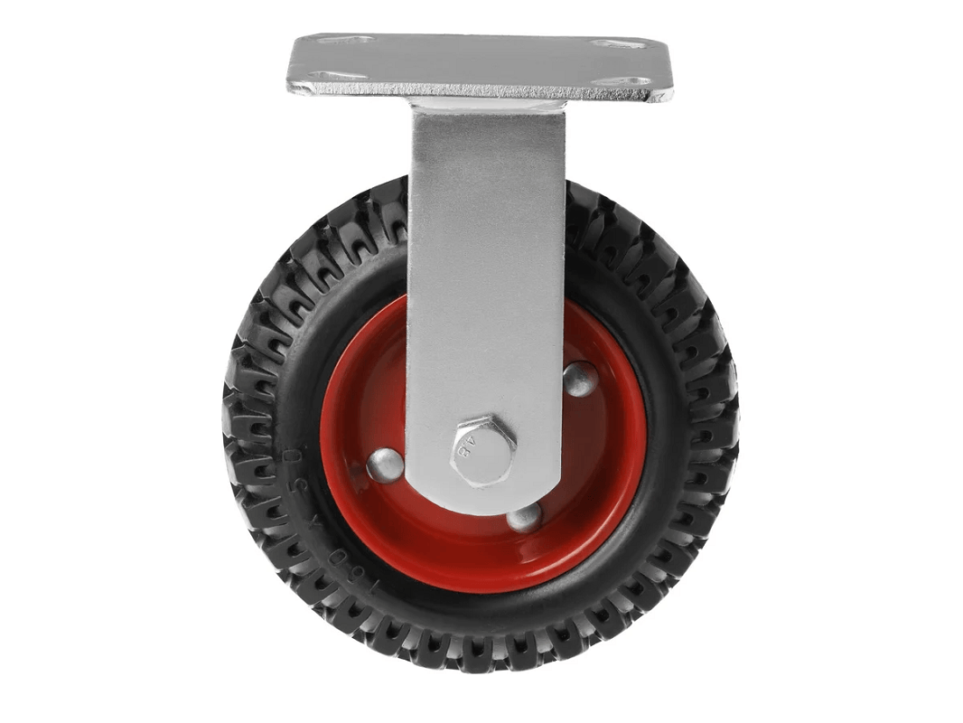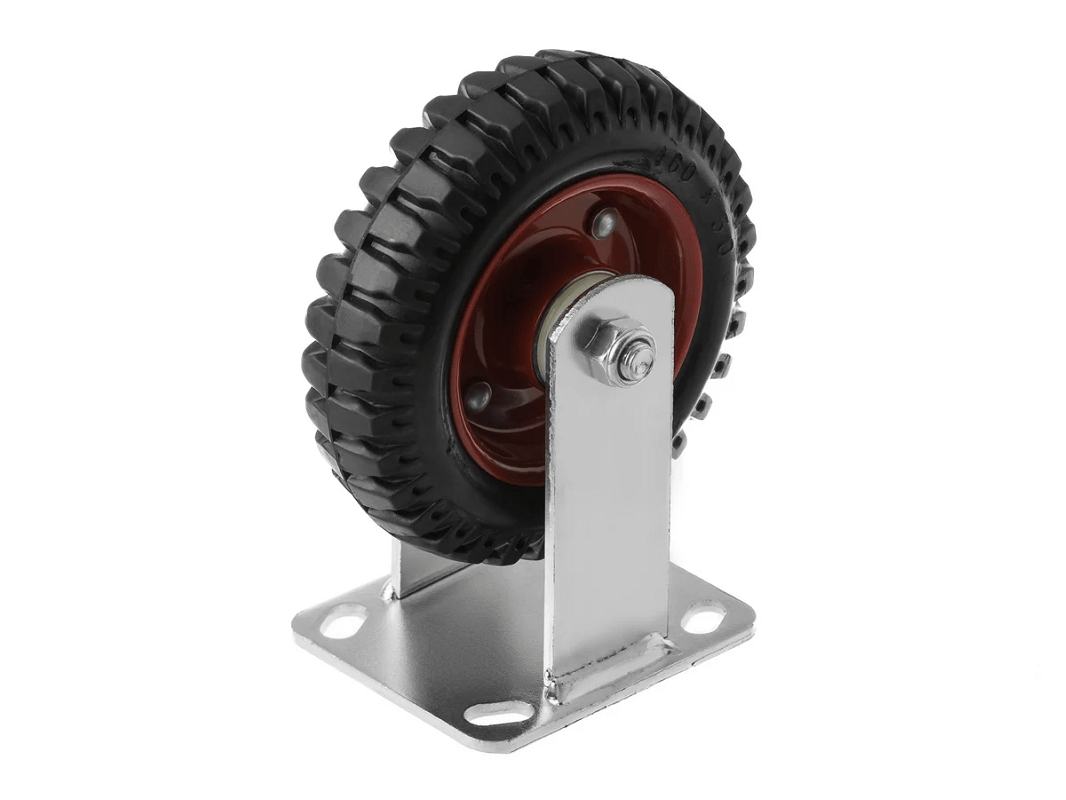 Колесо литое с протекторной резиной, металлическим ободом и шариковым подшипником, ось 17 мм, с неповоротной площадкой PF 160 (160 мм/400 кг) — это прочный и надёжный вариант для садовой и строительной техники. Они изготовлены из стального обода, шарикового подшипника и протекторной шины.