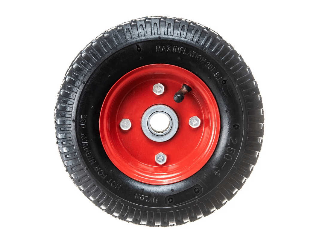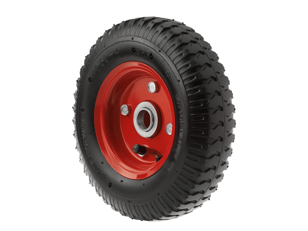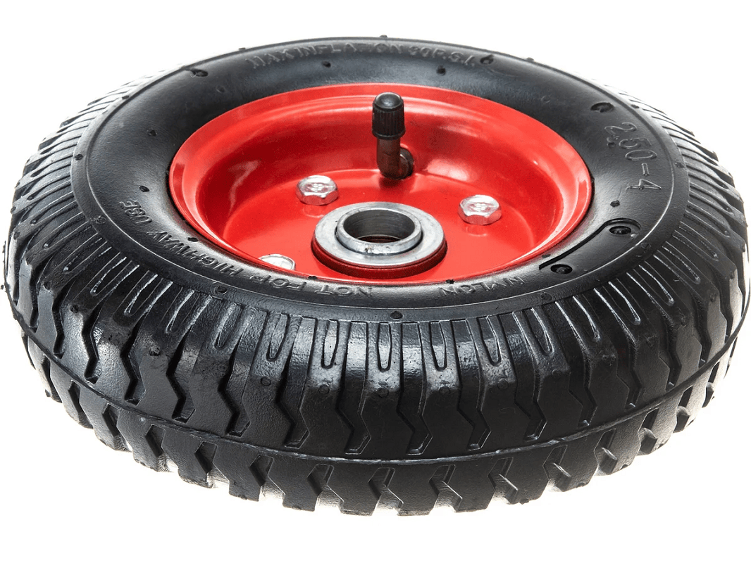 Колесо пневматическое 2.50-4 с несимметричной ступицей, металлическим ободом и шариковым подшипником, ось 20 мм, PR 1400-20n (210 мм/100 кг) предназначены для садовых и строительных тачек, а также для четырёхколёсных тележек с поворотной осью, рассчитанных на использование в различных условиях, включая уличные.