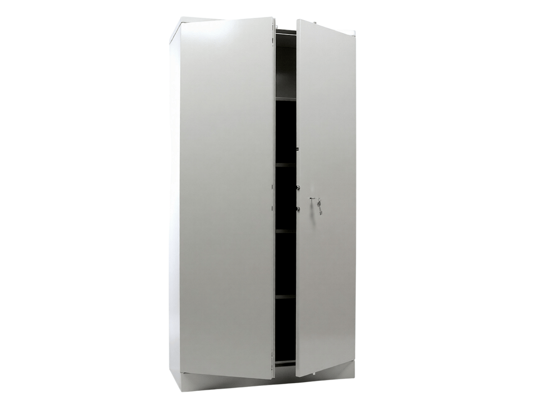 Стандартный цвет шкафа — серый полуматовый, но по вашему желанию его можно окрасить в другие цвета по шкале RAL. Этот компактный шкаф имеет высоту 1830 мм и весит всего 66 килограмм. Полностью сварная конструкция, усиленные внутренние петли с углом открывания двери на 90 градусов.