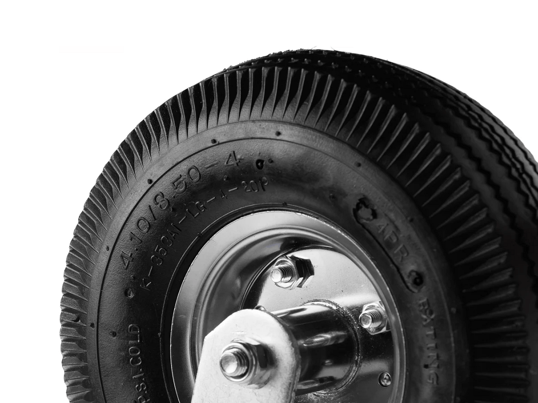 Колесо пневматическое 3.50-4 с поворотной площадкой и металлическим ободом PRS 85 (266 мм/130 кг). Благодаря своей конструкции, колесо обеспечивает отличную маневренность даже на неровных поверхностях. Оно способно выдерживать значительные нагрузки, не деформируясь при этом. Колесо легко монтируется и при необходимости поддается ремонту.