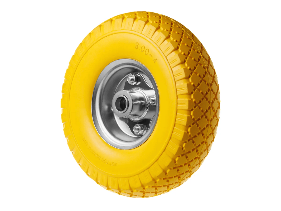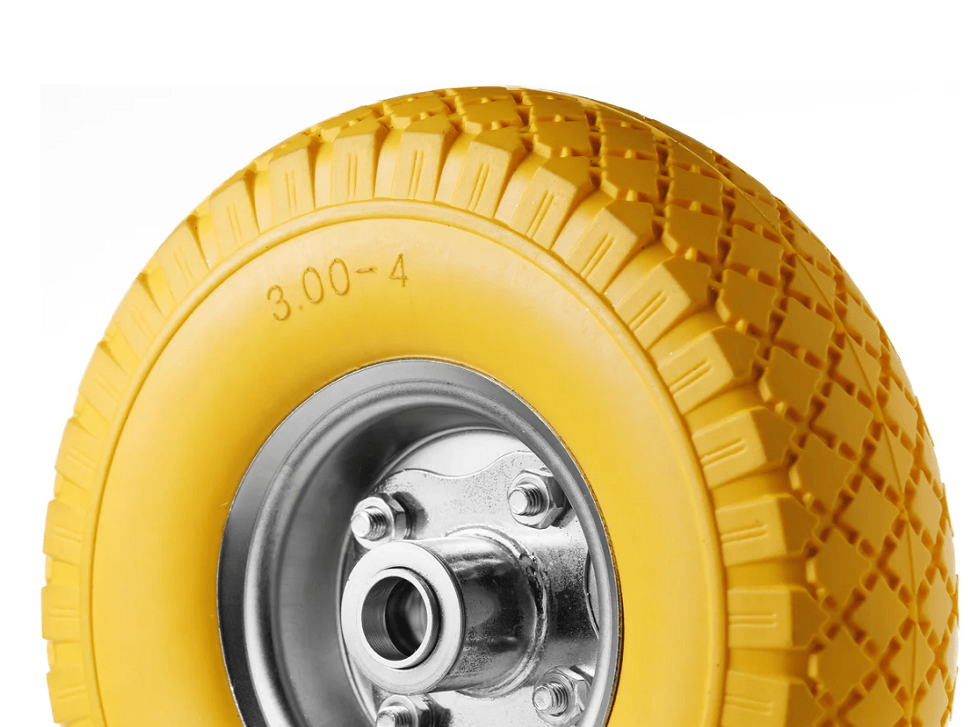 Колесо пенополиуретановое 3.00-4 с симметричной ступицей, металлическим ободом и шариковым подшипником, ось 20 мм PU 1804-20 (260 мм/120 кг). Его преимущество — в прочности и долговечности, шину сложно проколоть, но даже в таком случае колесо не выходит сразу из строя, пружинит. Грузоподъёмность — до 120 кг.