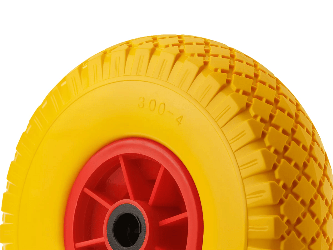 Колесо пенополиуретановое 3.00-4 с симметричной ступицей, пластиковым ободом и роликовым подшипником, ось 20 мм PU 1807-20 (260 мм/120 кг) отличительной чертой являются прочность и долговечность: шина с трудом прокалывается, а в случае прокола колесо не выходит из строя сразу, а пружинит.