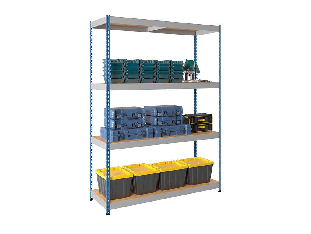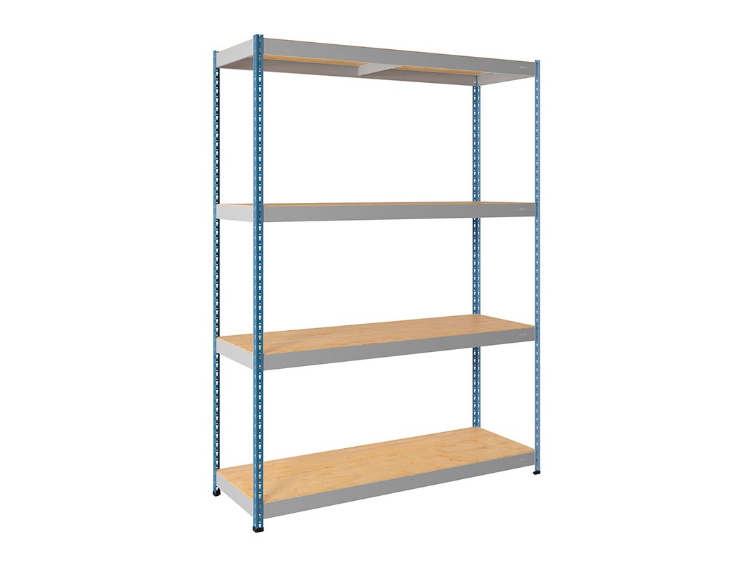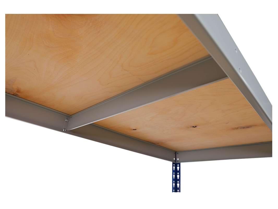 Повышенная грузоподъемность до 300 килограмм на полку за счет стяжки балок, которая устанавливается под полку и служит дополнительным ребром жесткости. Стеллаж собирается без помощи инструмента и болтов, сама установка занимает не более 15 минут на одну секцию. В комплект поставки входит настил из фанеры с габаритами 1830х610 мм, что идеально подходит для установки как ярус.