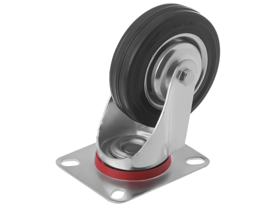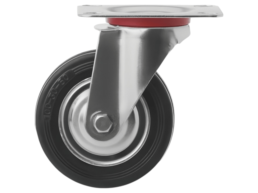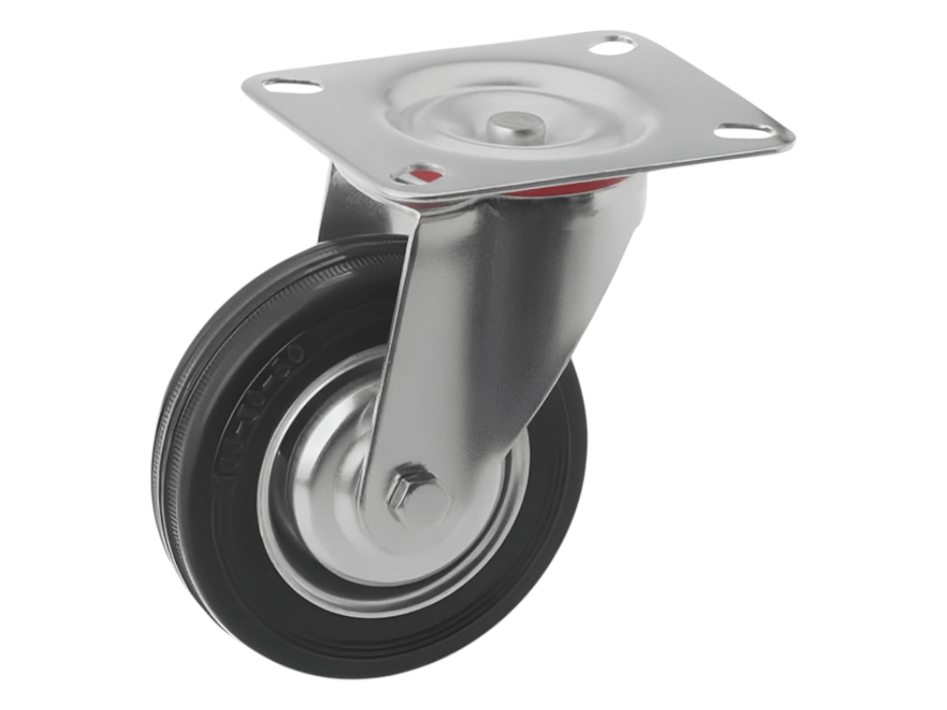 Промышленные колеса с поворотной площадкой из черной резины SC 42 устанавливаются на платформенные тележки, мусорные контейнеры, промышленное оборудование, строительные вышки и другие виды техники. Благодаря поворотному механизму делают её более манёвренной и лёгкой в управлении.
