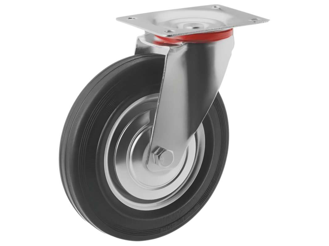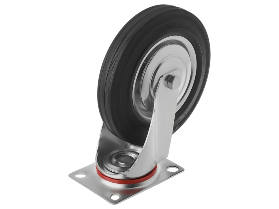 Промышленные колеса с поворотной площадкой из черной резины SC 80 устанавливаются на платформенные тележки, мусорные контейнеры, промышленное оборудование, строительные вышки и другие виды техники. Благодаря поворотному механизму делают её более манёвренной и лёгкой в управлении.