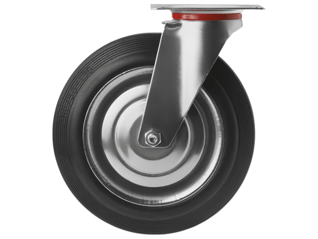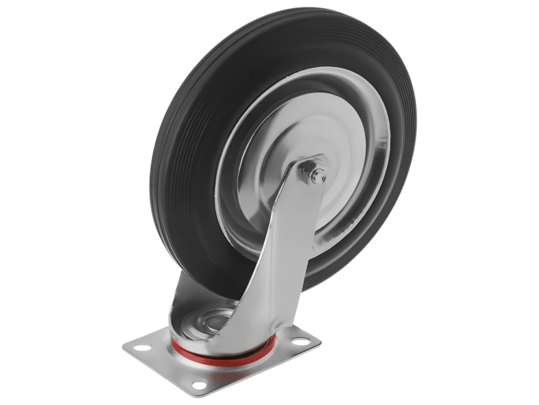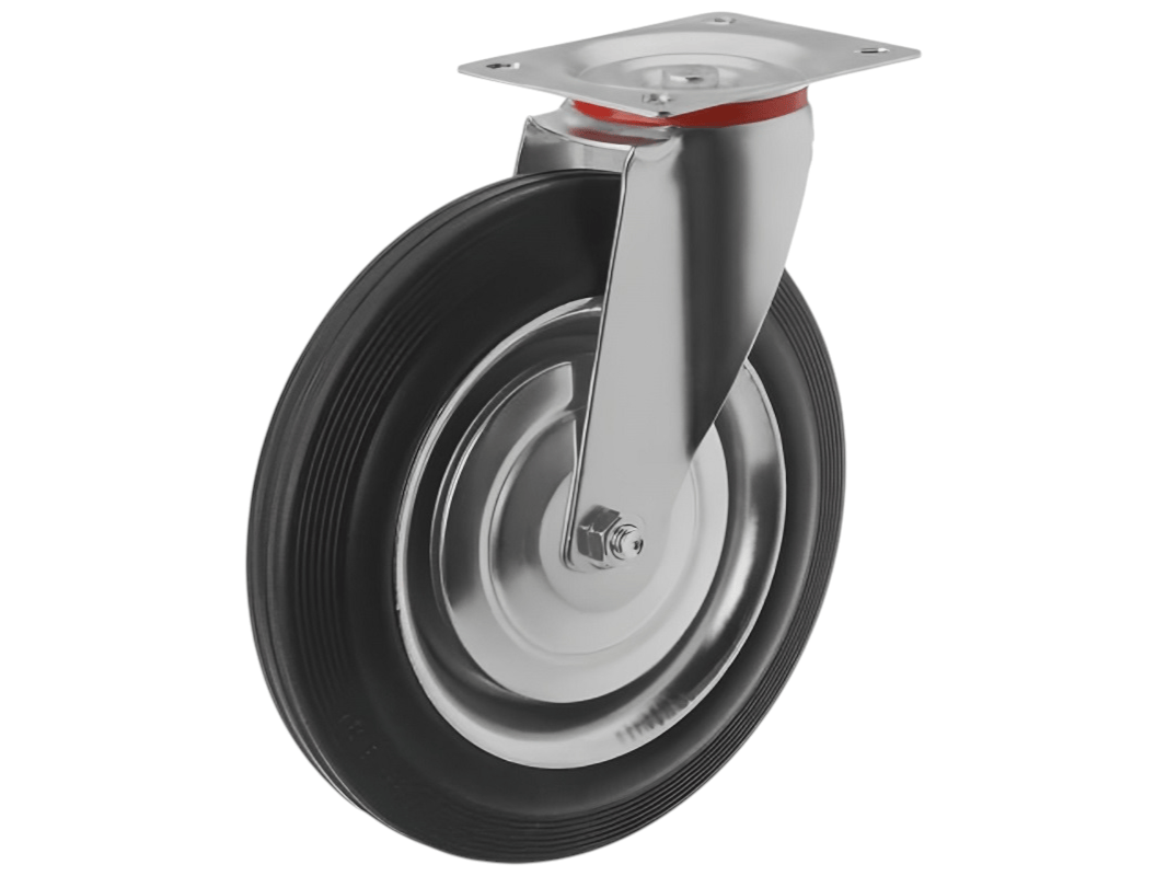 Промышленные колеса с поворотной площадкой из черной резины SC 85 устанавливаются на платформенные тележки, мусорные контейнеры, промышленное оборудование, строительные вышки и другие виды техники. Благодаря поворотному механизму делают её более манёвренной и лёгкой в управлении.
