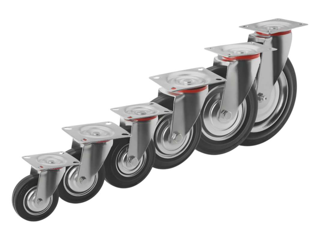 Эта модель поворотных колёс с креплением доступна в семи вариантах, отличающихся диаметром от 75 до 250 мм и грузоподъёмностью от 50 до 210 килограмм.