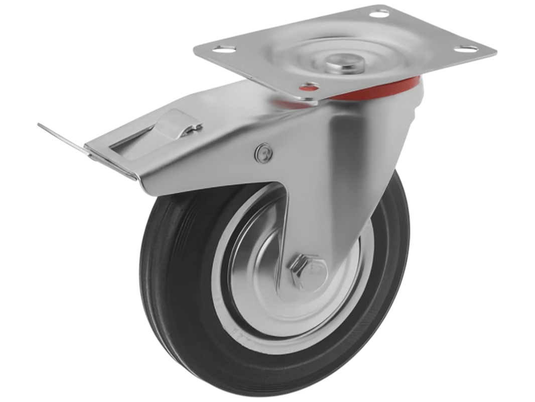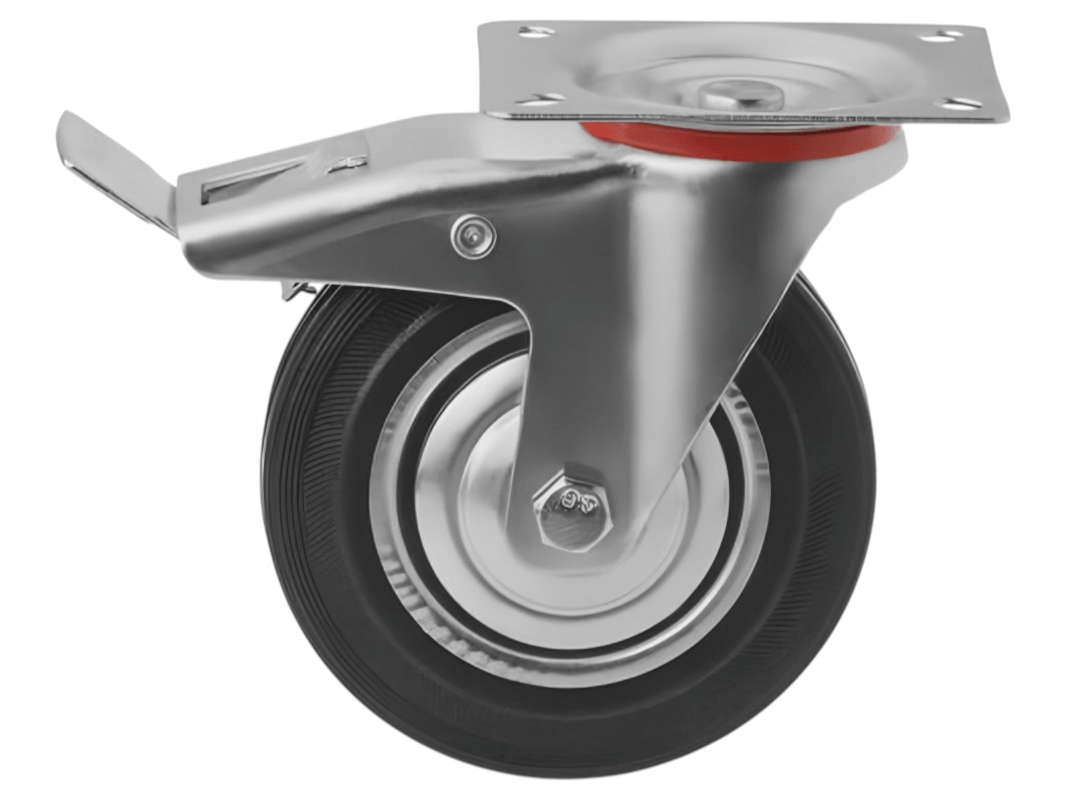 Промышленные колеса с поворотной площадкой и тормозом из черной резины SCB 63 предназначены для установки на платформенные тележки, мусорные контейнеры, промышленное оборудование и строительные вышки. Поворотный механизм обеспечивает маневренность и легкость в управлении, а тормоз позволяет зафиксировать тележку на месте.
