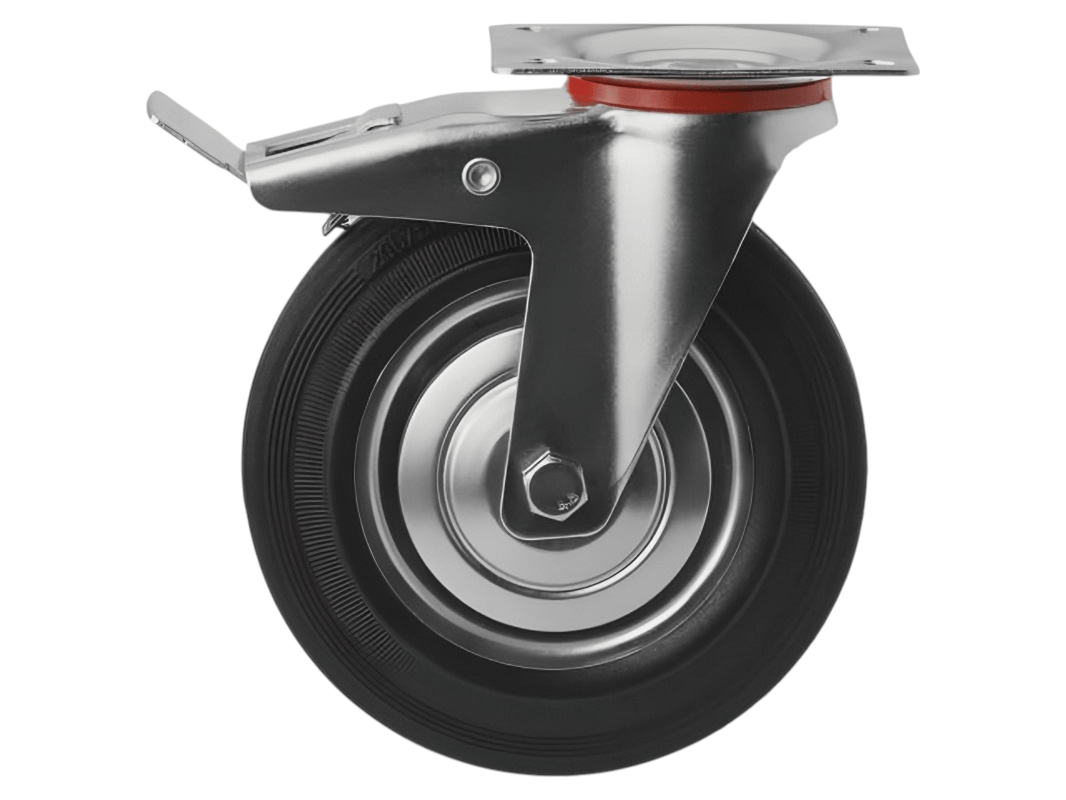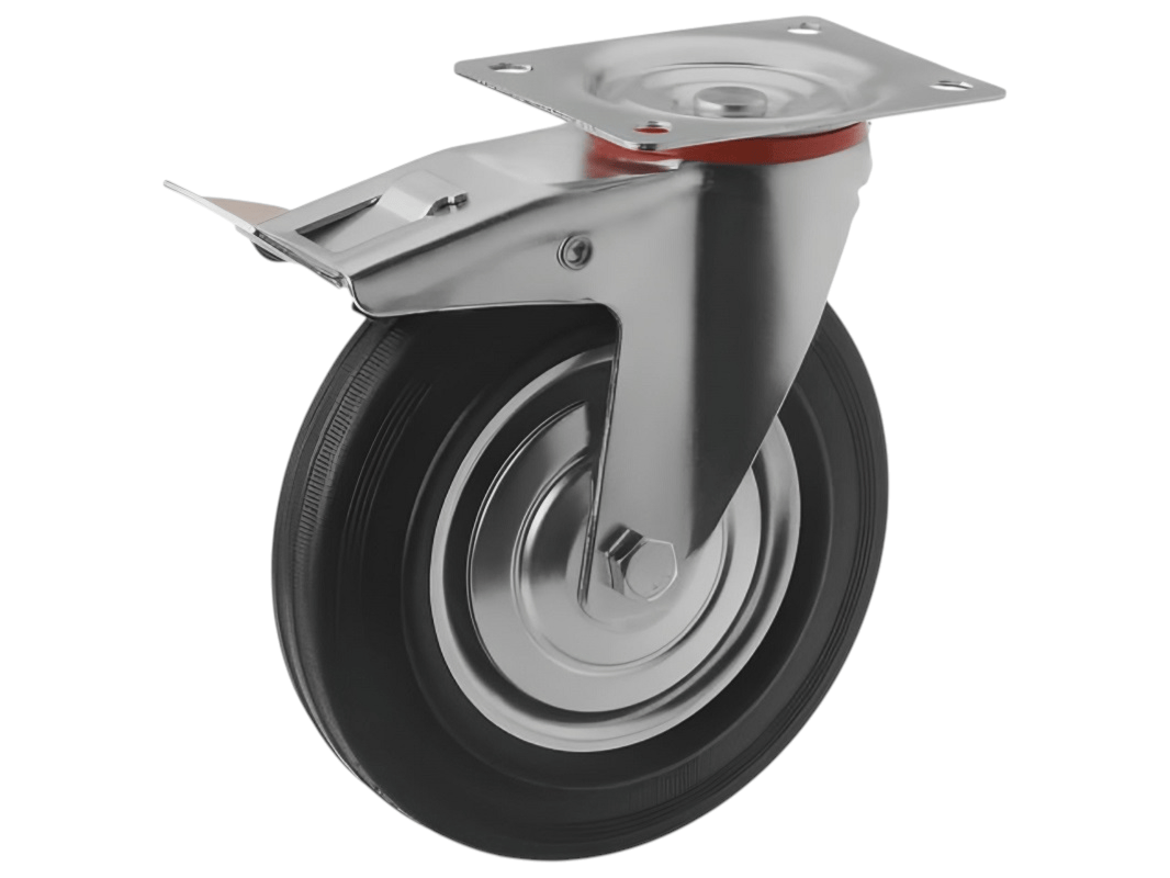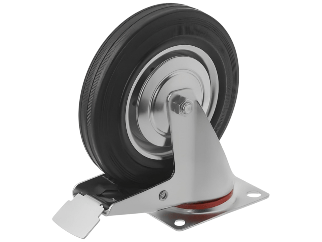 Промышленные колеса с поворотной площадкой и тормозом из черной резины SCB 80 предназначены для установки на платформенные тележки, мусорные контейнеры, промышленное оборудование и строительные вышки. Поворотный механизм обеспечивает маневренность и легкость в управлении, а тормоз позволяет зафиксировать тележку на месте.