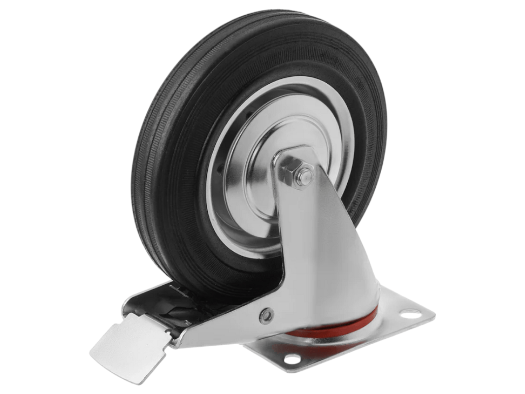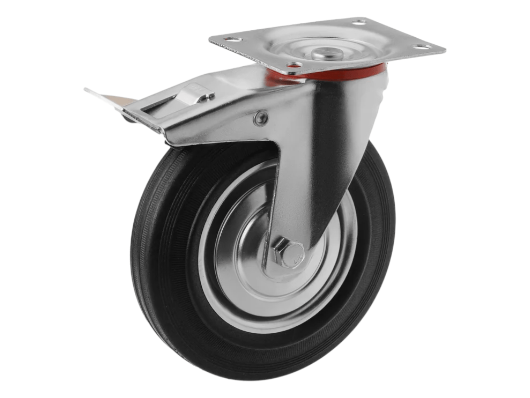 Промышленные колеса с поворотной площадкой и тормозом из черной резины SCB 85 предназначены для установки на платформенные тележки, мусорные контейнеры, промышленное оборудование и строительные вышки. Поворотный механизм обеспечивает маневренность и легкость в управлении, а тормоз позволяет зафиксировать тележку на месте.