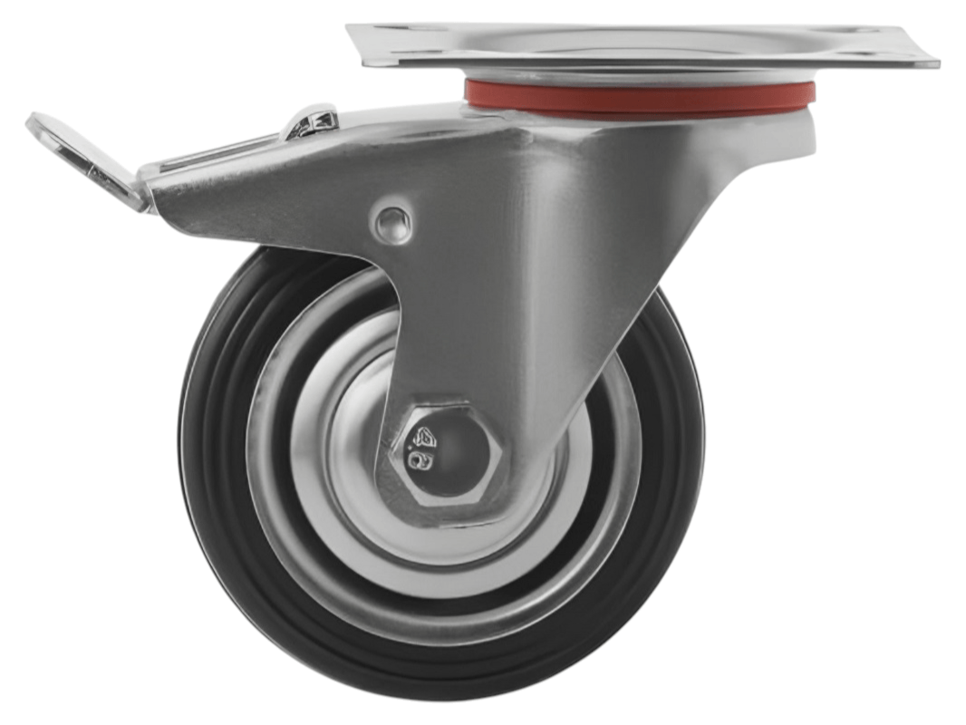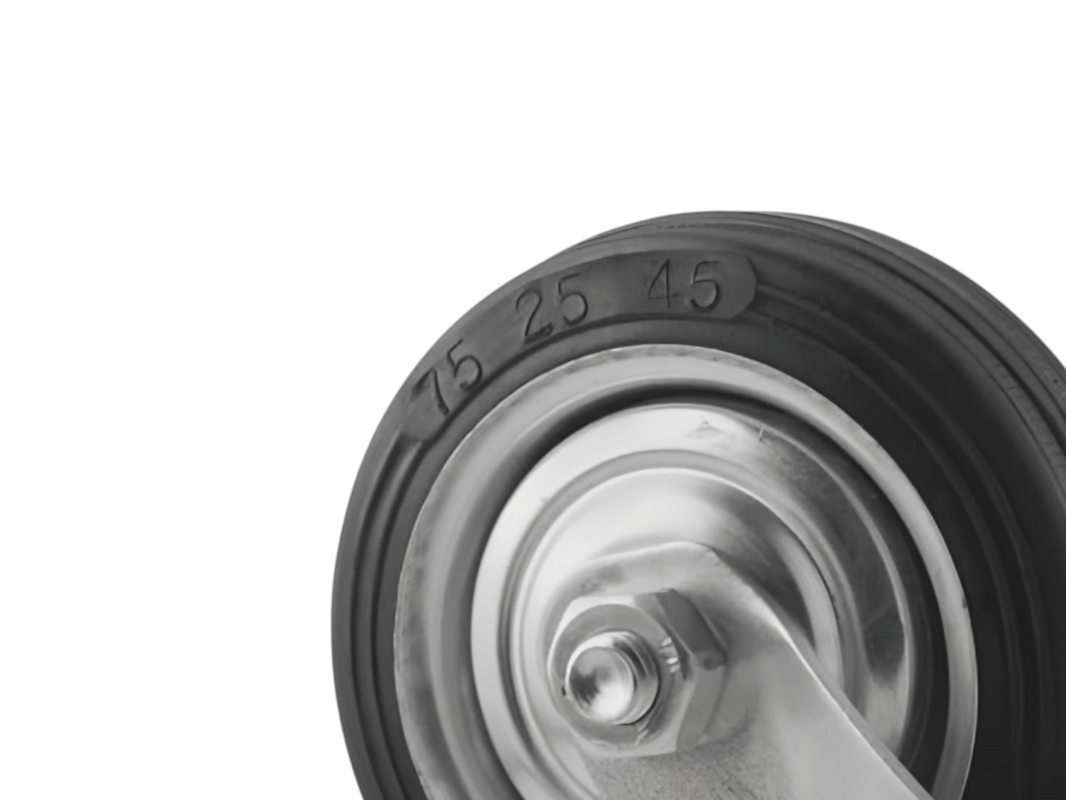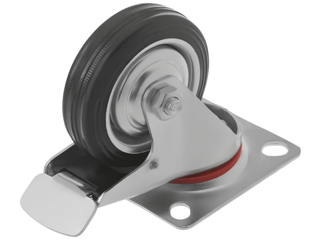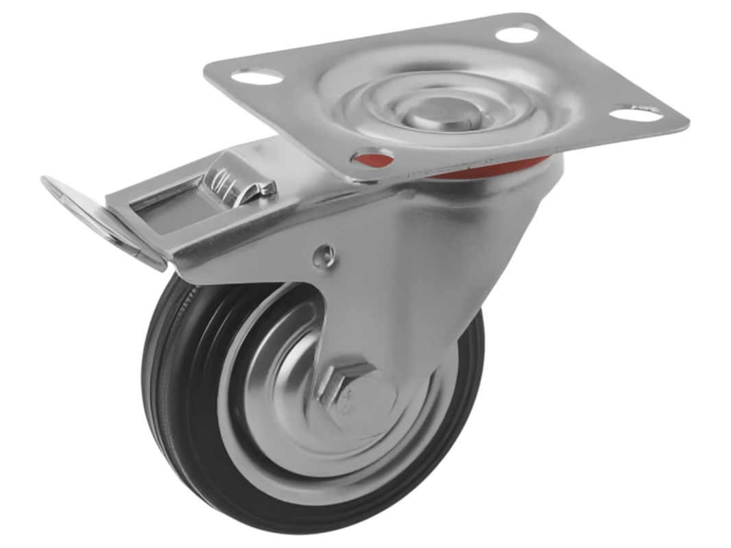 Промышленные колеса с поворотной площадкой и тормозом из черной резины SCB 93 предназначены для установки на платформенные тележки, мусорные контейнеры, промышленное оборудование и строительные вышки. Поворотный механизм обеспечивает маневренность и легкость в управлении, а тормоз позволяет зафиксировать тележку на месте.