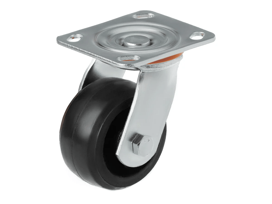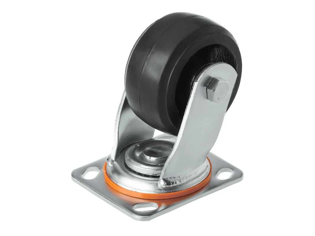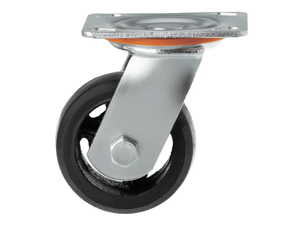 Колесо чугунное большегрузное с неповоротной площадкой и литым резиновым слоем SCD 42 (100 мм/130 кг) – платформа под 4 болта. Поворотный механизм добавляет маневренности и делает эксплуатацию легче и удобнее.