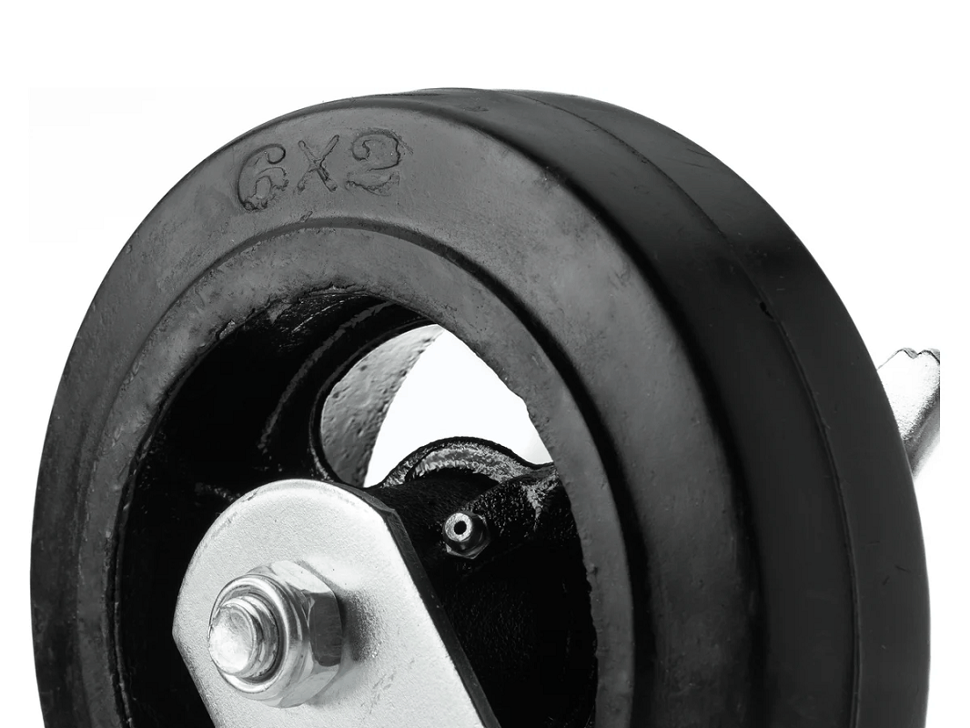 Колесо чугунное большегрузное с поворотной площадкой и тормозом и литым резиновым слоем SCDB 63 (150 мм/230 кг), тип крепления – платформа под 4 болта. Поворотный механизм добавляет маневренности и делает эксплуатацию легче и удобнее. А тормоз позволяет зафиксировать на месте складскую технику и безопасно совершить разгрузо-погрузочные работы.