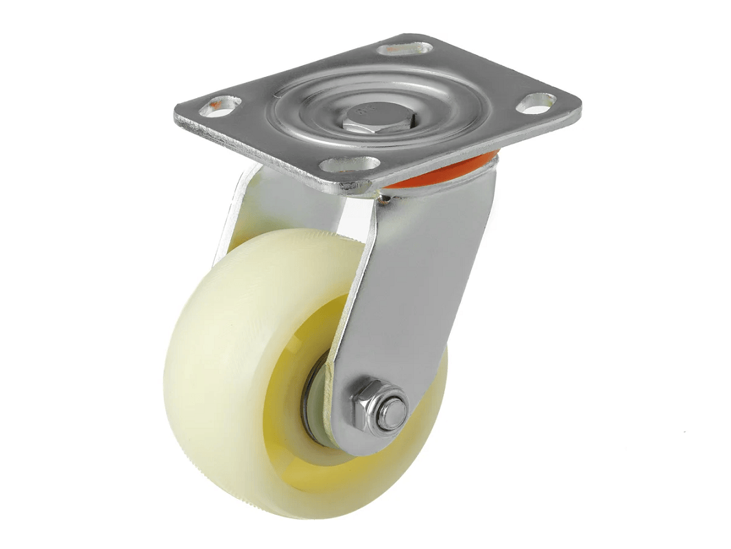Нейлоновые колеса зачастую используются в торговых центрах и в медицинских учреждениях благодаря своим уникальным свойствам. Отсутствует износ при использовании на ровной поверхности, защита от коррозии благодаря оцинковке кронштейна. Использование в агрессивной химической среде (моющие средства, масла и т. п.).
