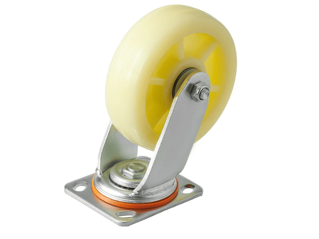 - Эти колёса изготовлены из прочного нейлона, что обеспечивает их долговечность и устойчивость к износу. Нейлон также обладает отличными амортизационными свойствами, что снижает вибрацию и шум при движении;