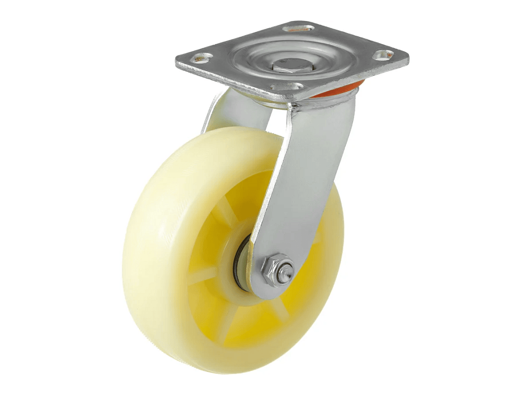 Нейлоновые колеса зачастую используются в торговых центрах и в медицинских учреждениях благодаря своим уникальным свойствам. Отсутствует износ при использовании на ровной поверхности, защита от коррозии благодаря оцинковке кронштейна. Использование в агрессивной химической среде (моющие средства, масла и т. п.).