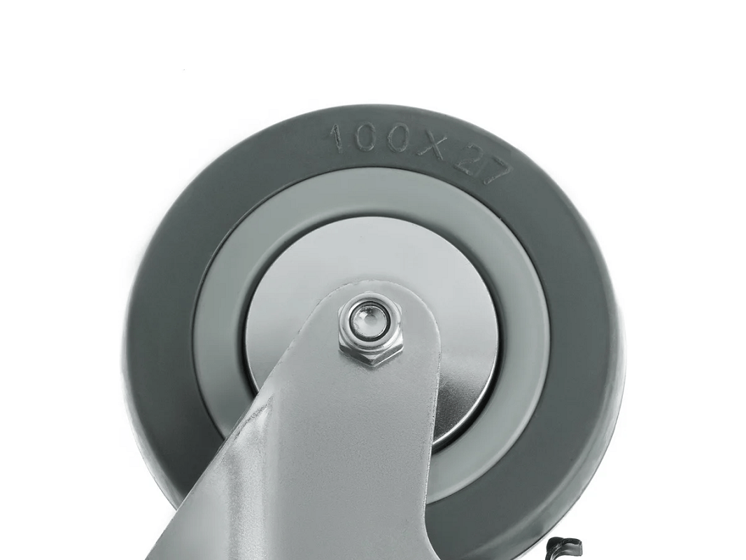 Устойчивый к коррозии стальной кронштейн надёжно фиксирует поворотный узел с двухрядным шарикоподшипником. Крепление осуществляется на платформе с помощью четырёх болтов. Колёса являются поворотными, что значительно облегчает процесс транспортировки.