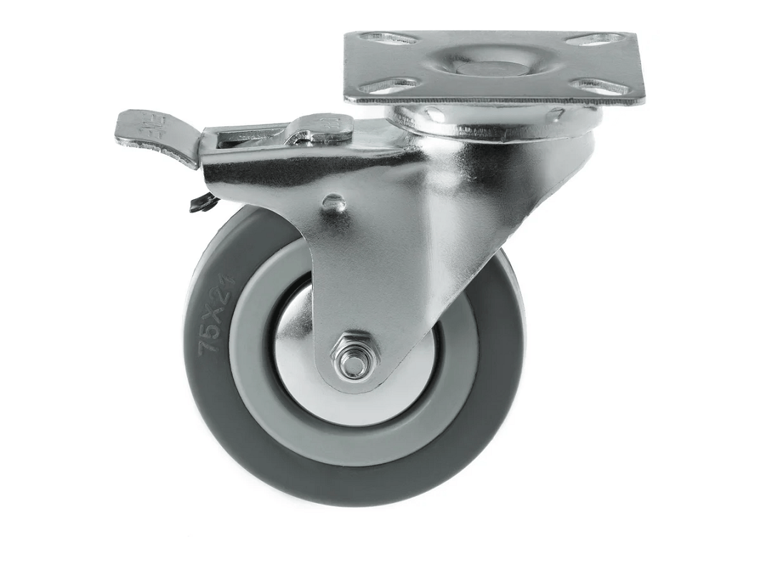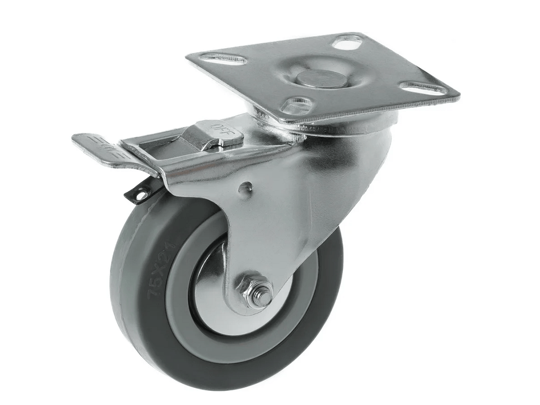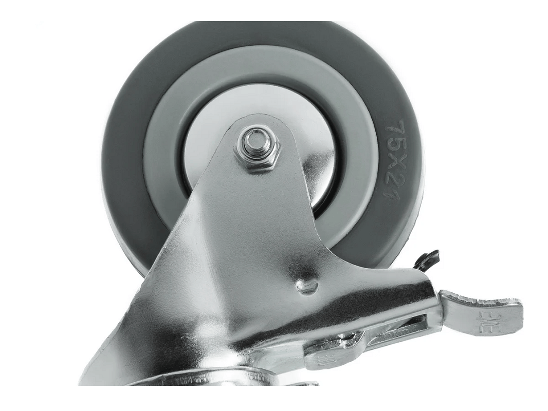 Ножной тормоз со стальным язычком позволяет надёжно фиксировать технику на месте. Эти колёса идеально подходят для небольших нагрузок и устанавливаются на медицинское, торговое, лабораторное и офисное оборудование, а также на мебель и технику, эксплуатируемую в закрытых помещениях.