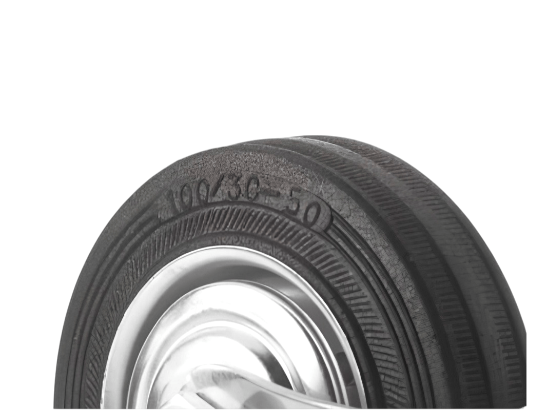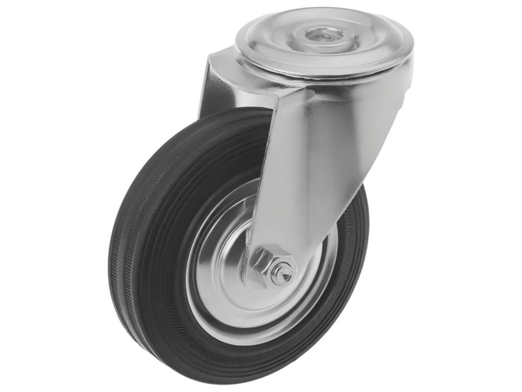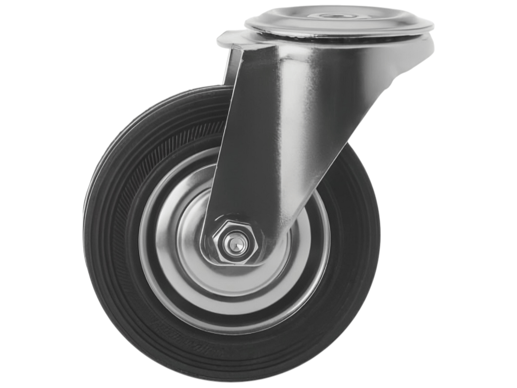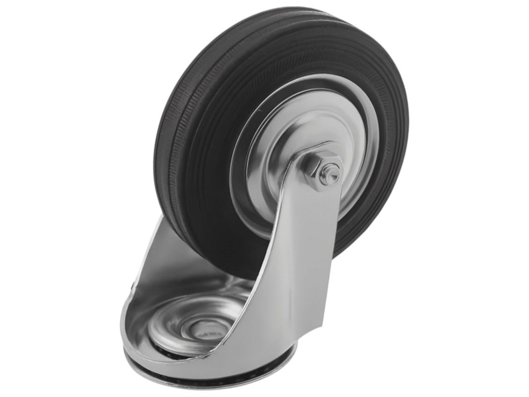 Конструкция колёс включает роликовый подшипник, стальной обод и шинку из чёрной резины, которая обеспечивает плавность и мягкость хода. Однако, по сравнению с полиуретановыми колёсами, эти колёса менее износостойки. Поворотный узел с двухрядным шарикоподшипником надёжно защищён пластиковым пыльником, что обеспечивает длительный срок службы.