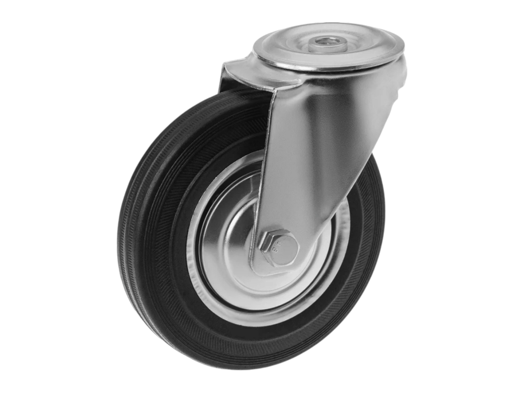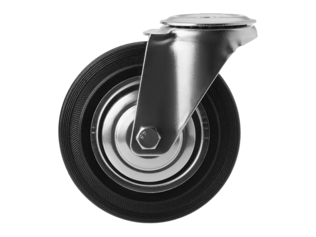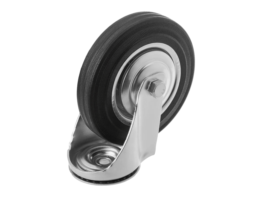 Конструкция колёс включает роликовый подшипник, стальной обод и шинку из чёрной резины, которая обеспечивает плавность и мягкость хода. Однако, по сравнению с полиуретановыми колёсами, эти колёса менее износостойки. Поворотный узел с двухрядным шарикоподшипником надёжно защищён пластиковым пыльником, что обеспечивает длительный срок службы.