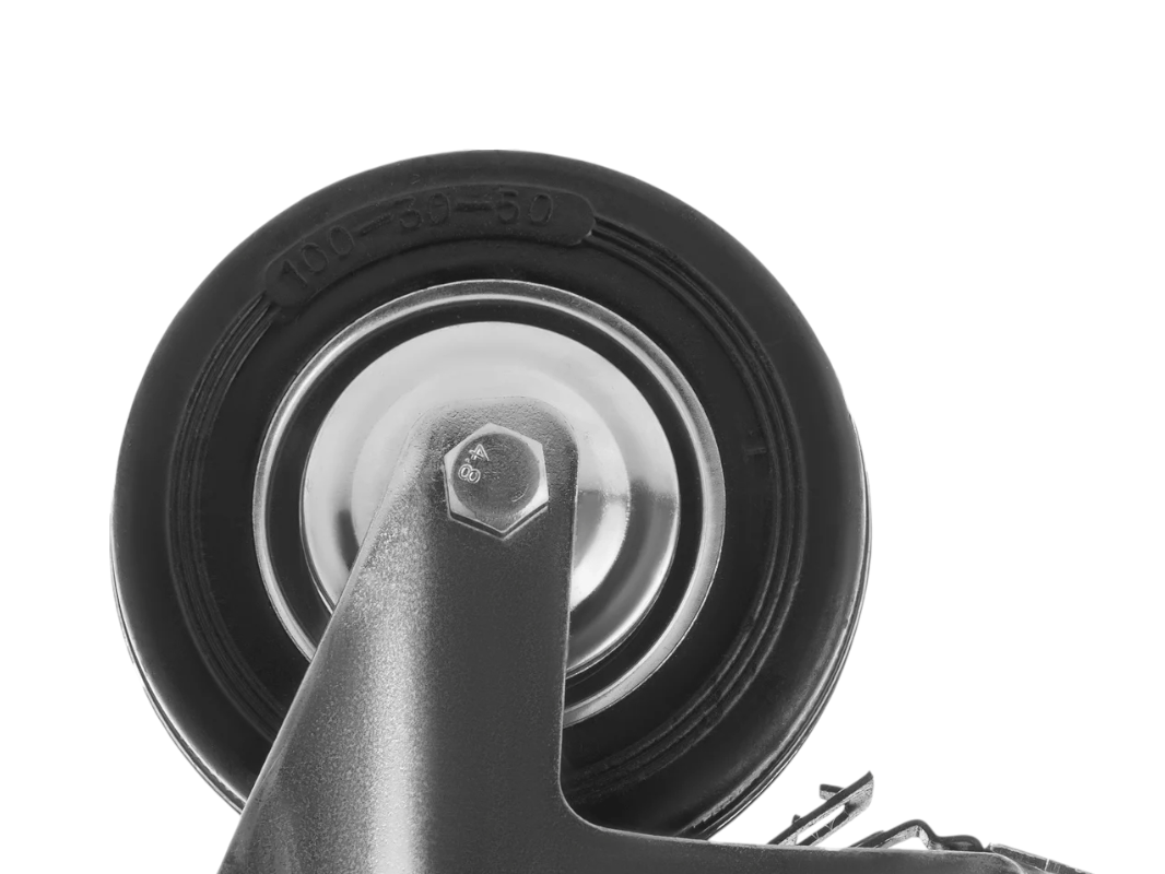 Конструкция колёс включает роликовый подшипник, стальной обод и шинку из чёрной резины, которая обеспечивает плавность и мягкость хода. Однако, по сравнению с полиуретановыми колёсами, эти колёса менее износостойки. Поворотный узел с двухрядным шарикоподшипником надёжно защищён пластиковым пыльником, что обеспечивает длительный срок службы.