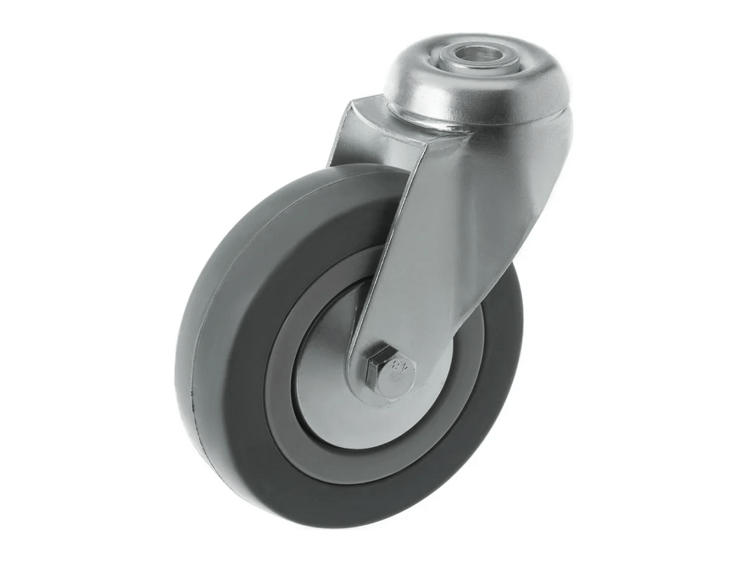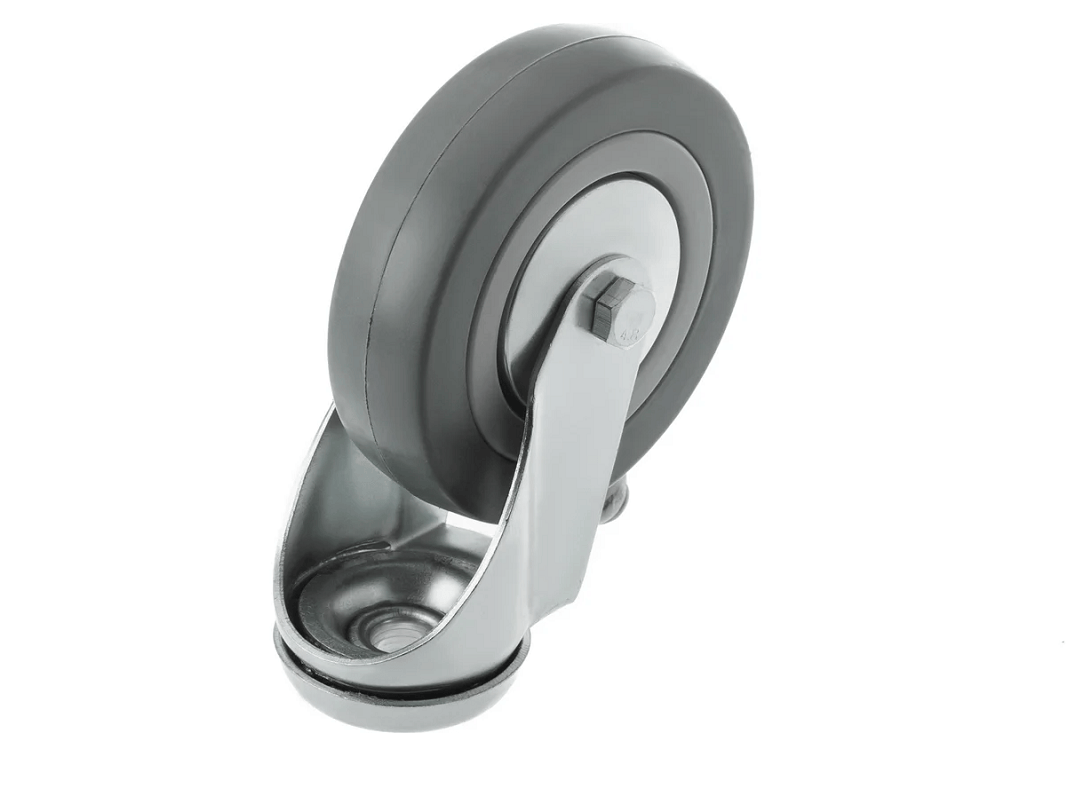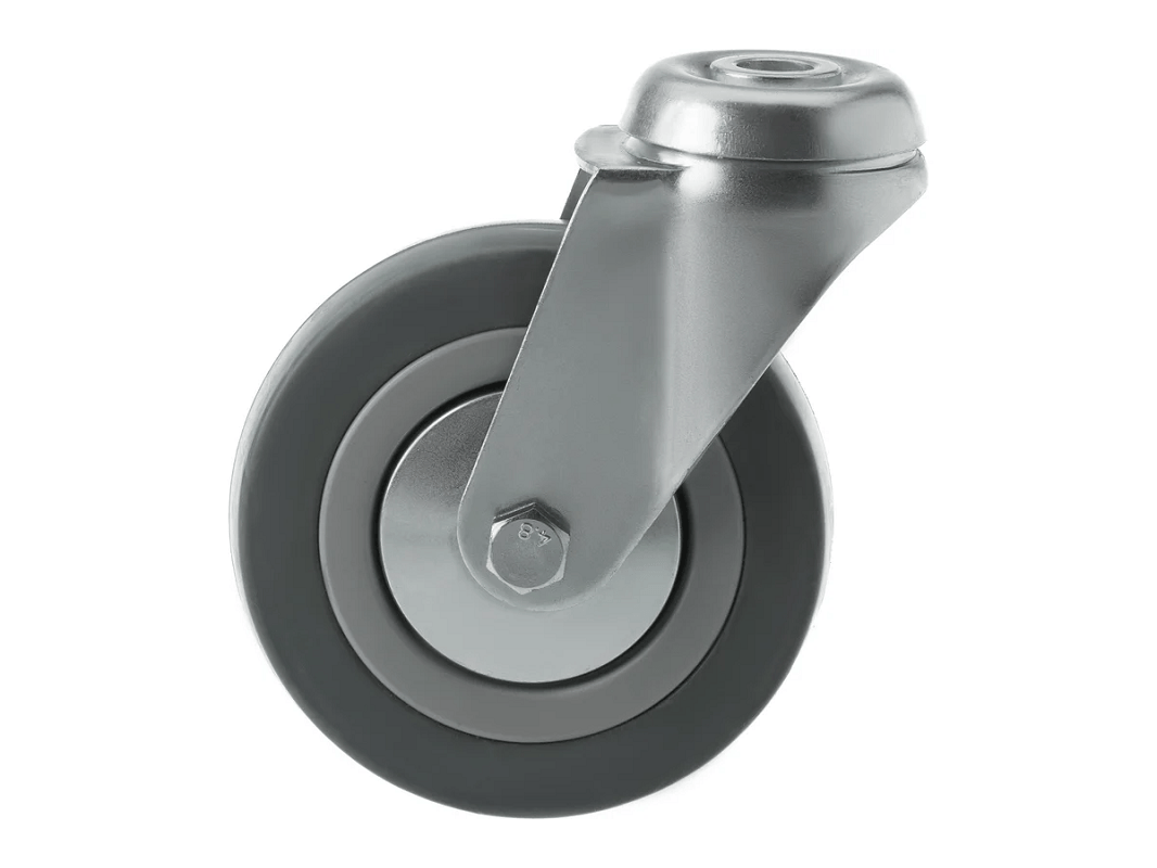 Колесо аппаратное под болт М10 SChg 42 (100 мм/80 кг), выполненный из серой резины и оснащённый подшипником скольжения. Колёса не оставляют следов на поверхности и отличаются практически бесшумным ходом по ровным поверхностям.