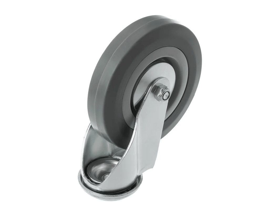 Колесо аппаратное под болт М12 SChg 63 (150 мм/140 кг), выполненный из серой резины и оснащённый подшипником скольжения. Колёса не оставляют следов на поверхности и отличаются практически бесшумным ходом по ровным поверхностям.