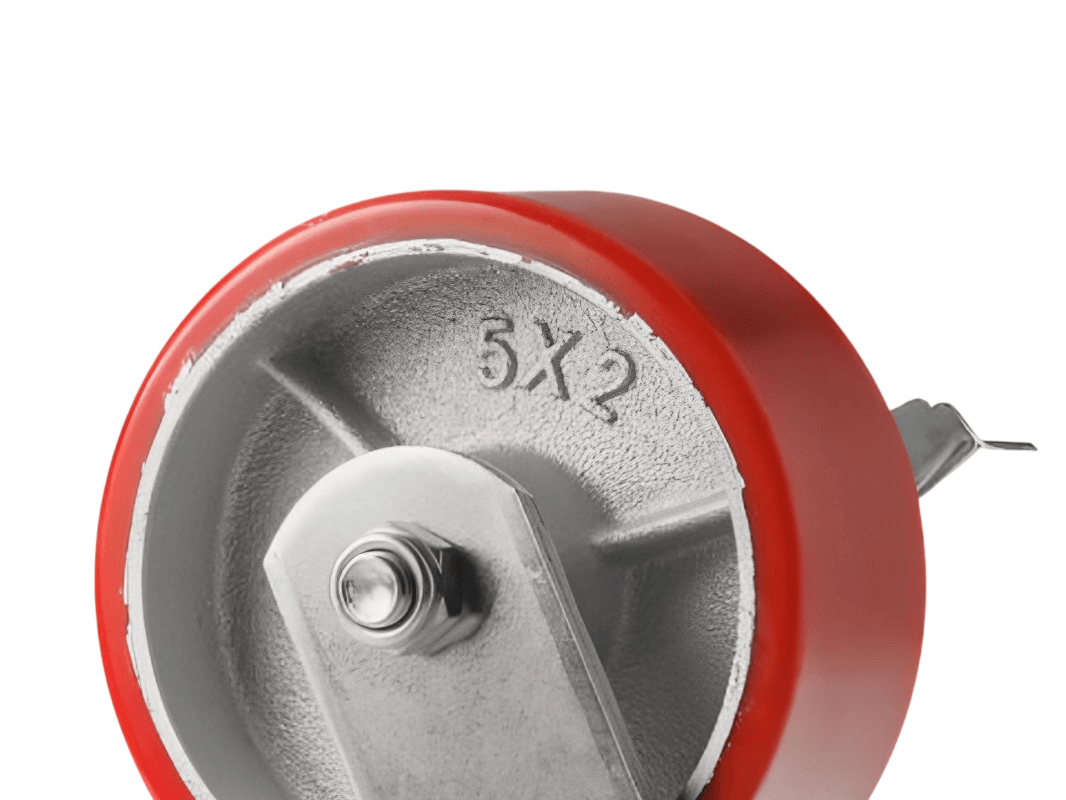 Шинка изготовлена из полиуретана, который надёжно соединён с чугунным ободом методом вулканизации, что исключает риск отслоения покрышки. Обод также оснащён дополнительными рёбрами жёсткости, а в оси установлен двойной шариковый подшипник, что обеспечивает стабильность и надёжность в эксплуатации.