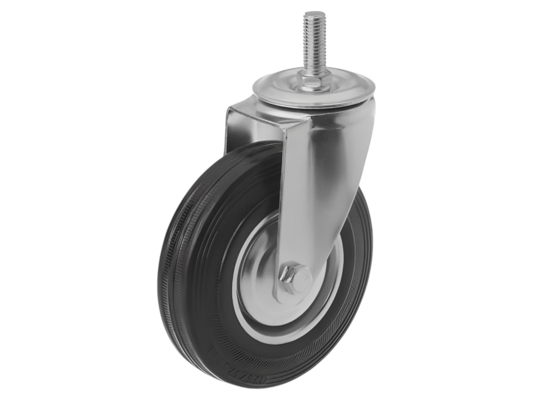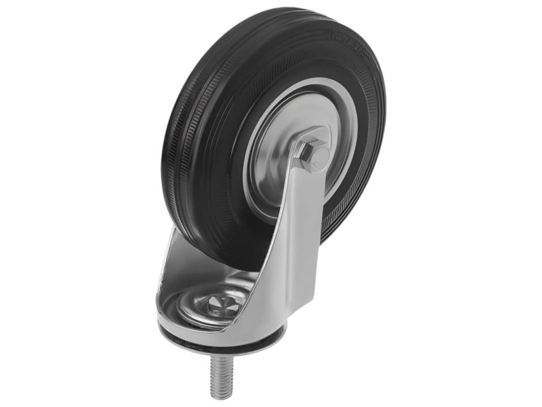 Конструкция колёс включает роликовый подшипник, стальной обод и шинку из чёрной резины, которая обеспечивает плавность и мягкость хода. Однако, по сравнению с полиуретановыми колёсами, эти колёса менее износостойки. Поворотный узел с двухрядным шарикоподшипником надёжно защищён пластиковым пыльником, что обеспечивает длительный срок службы.