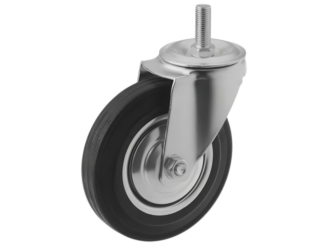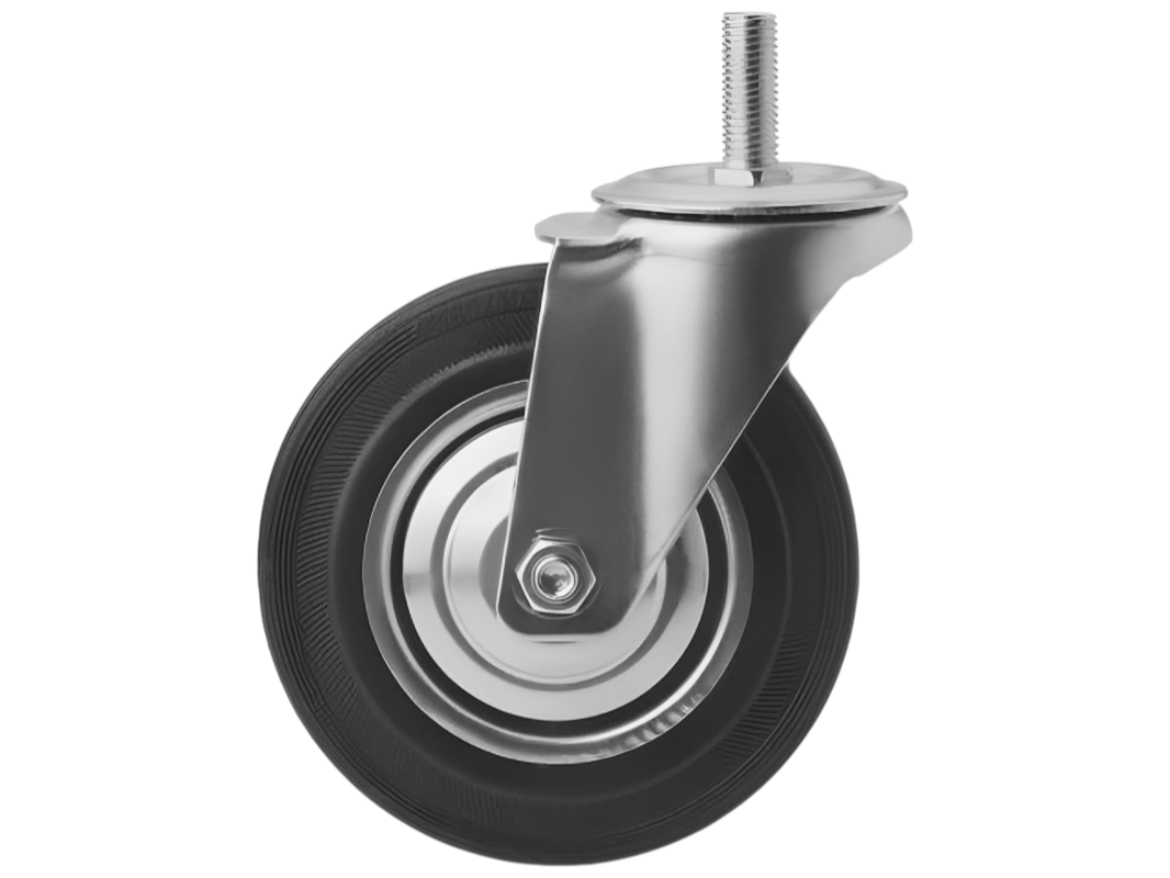 Конструкция колёс включает роликовый подшипник, стальной обод и шинку из чёрной резины, которая обеспечивает плавность и мягкость хода. Однако, по сравнению с полиуретановыми колёсами, эти колёса менее износостойки. Поворотный узел с двухрядным шарикоподшипником надёжно защищён пластиковым пыльником, что обеспечивает длительный срок службы.