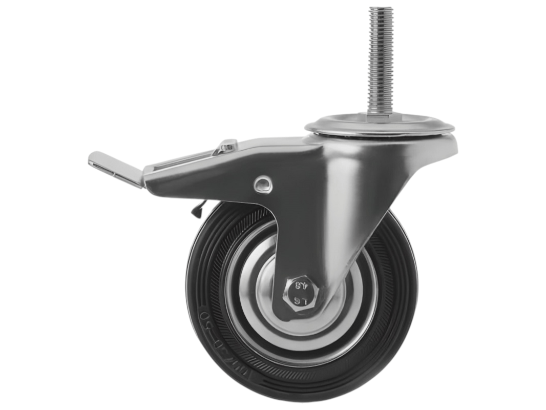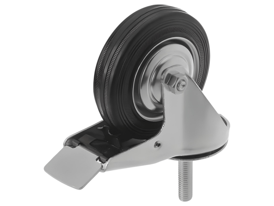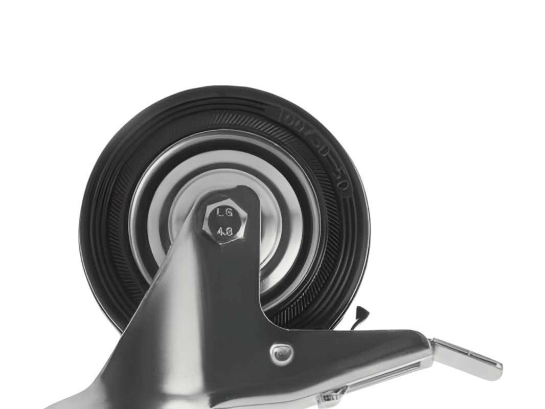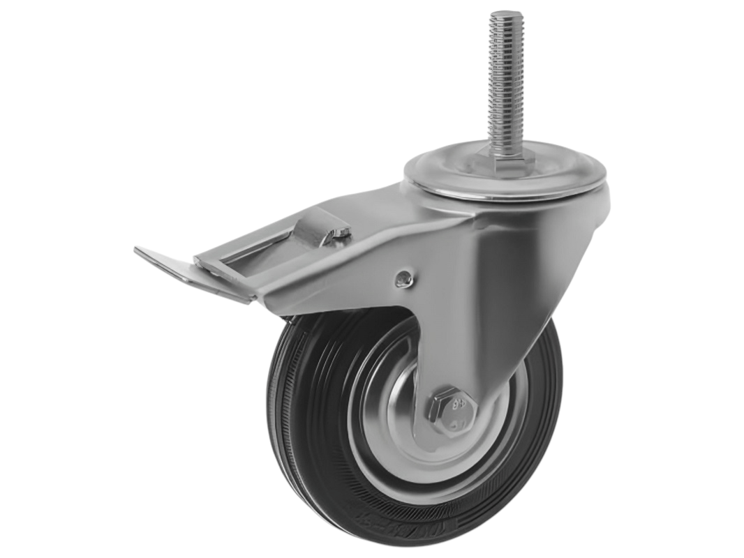 Поворотный узел колеса с двухрядным шарикоподшипником надёжно защищён пластиковым пыльником. Тормоз фиксируется нажатием на «педальку», которая расположена в легкодоступном месте перед оператором. Эта модель отличается поворотной осью и болтовым креплением с тормозом.