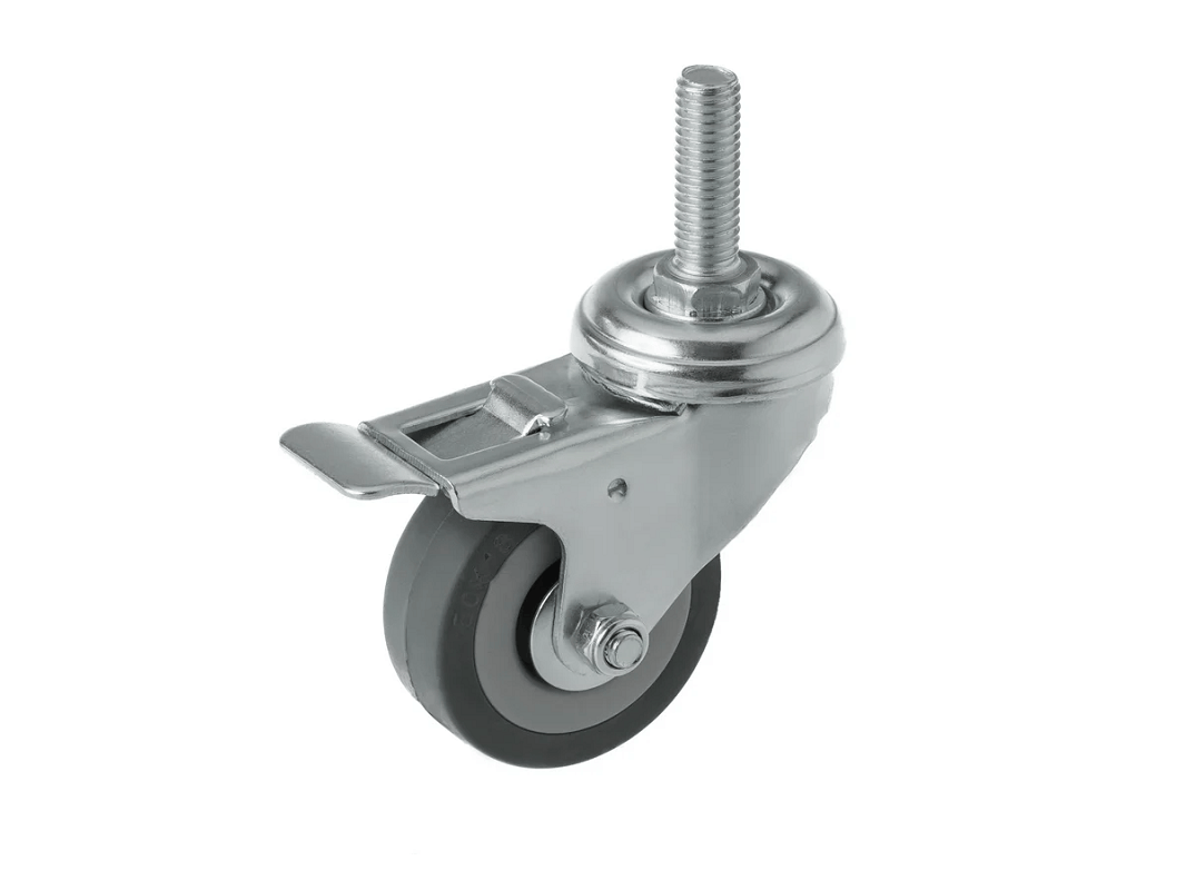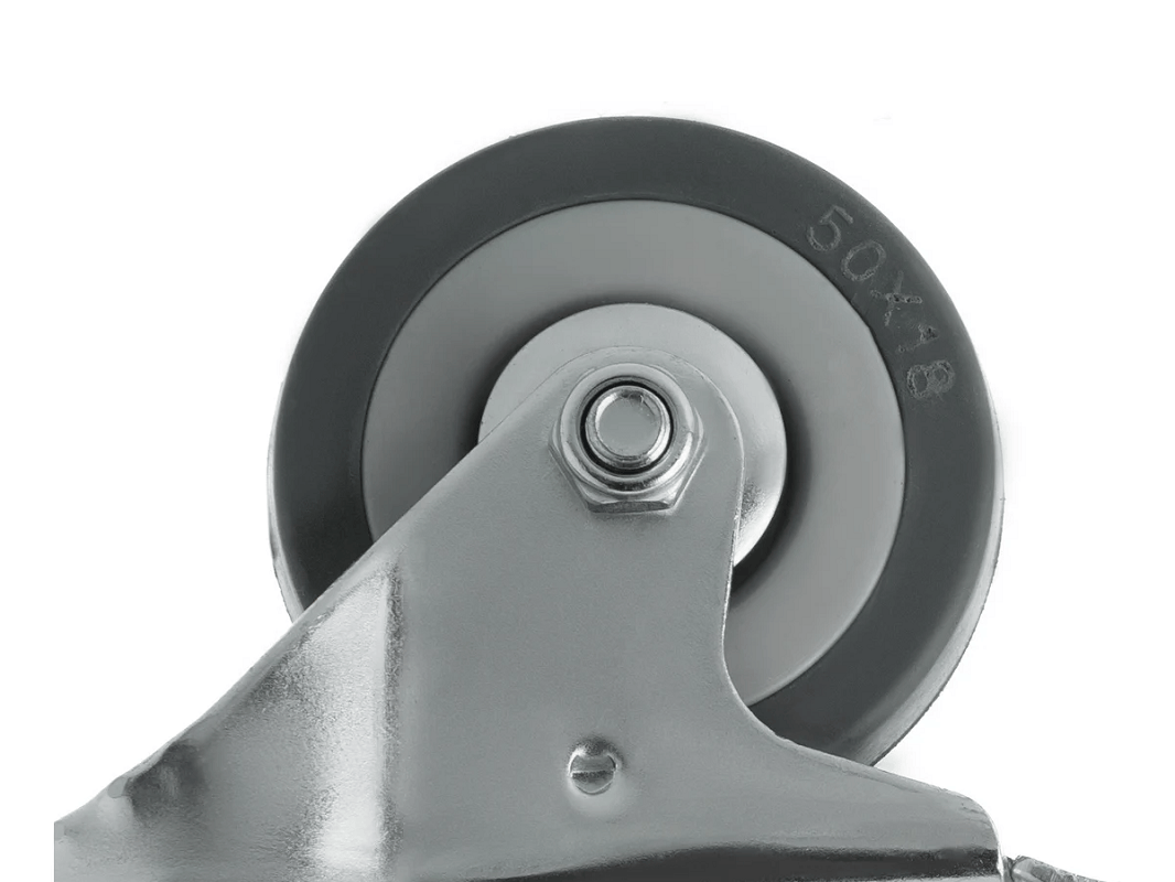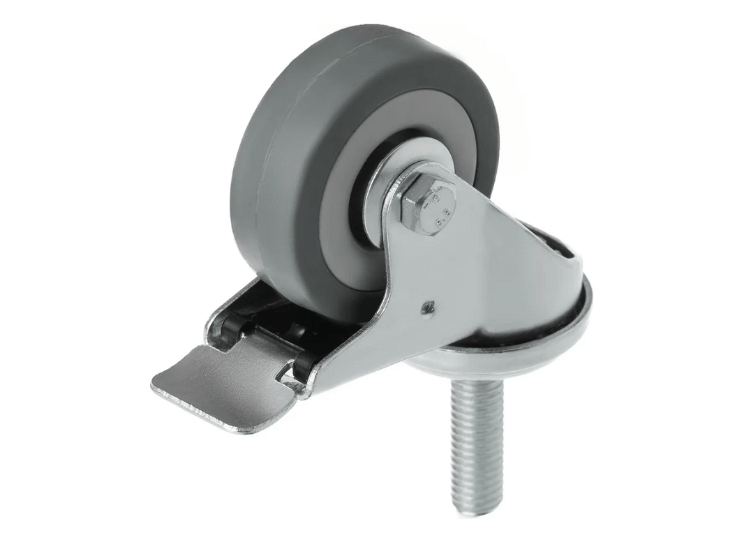 Колесо аппаратное с болтом М10 и тормозом SCtgb 25 (50 мм/50 кг). Ступица с подшипником скольжения и устойчивый к коррозии стальной кронштейн, а также поворотный узел с двухрядным шарикоподшипником — всё это обеспечивает долговечность и надежность конструкции. Кронштейн с болтовым креплением выполнен из оцинкованной стали, что добавляет прочности и долговечности.